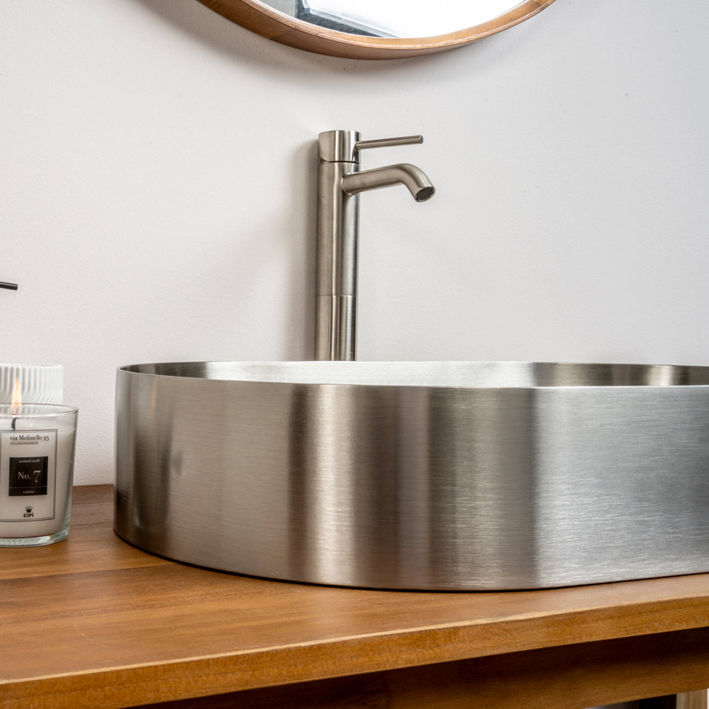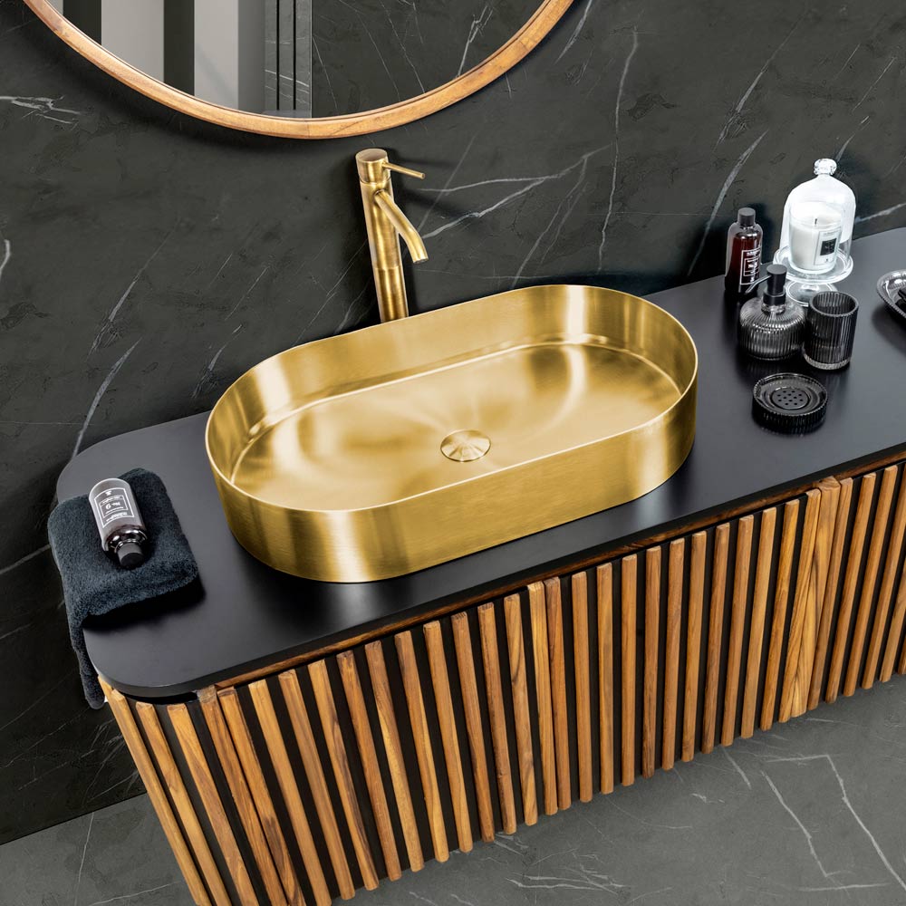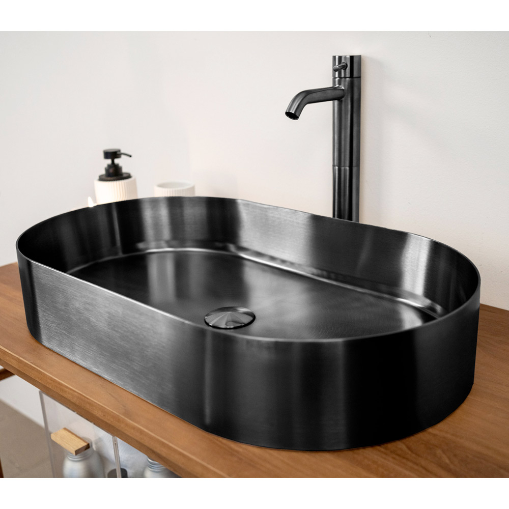 The oval countertop sink in 3 mm SUS 304 stainless steel is a jewel of design and functionality. Manufactured from a single sheet of metal, it offers a clean, modern aesthetic. The PVD+Nano coating finishing treatment, combined with meticulous brushing, gives an attractive and almost enigmatic appearance to the object, enhancing the shine and resistance to stains and scratches. The design is characterized by balanced shapes and ideal proportions, available in three finishes that elegantly adapt to any environment. Furthermore, refined details such as the coordinated drain cover included and the total absence of visible welding elevate this sink to a true masterpiece of craftsmanship and design, making it a standout piece for bathrooms with a luxurious and contemporary feel.