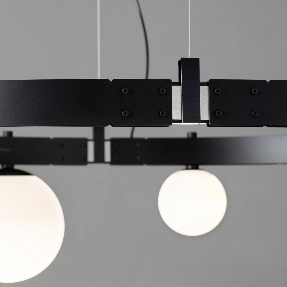 The oval bearing bar recalls the engineering structures of the past and the electrified modular structures support lighting bodies ( blown glass spheres of two different sizes) that can be placed in quantity and free arrangement, without the use of electrical power cables, for maximum freedom of expression.