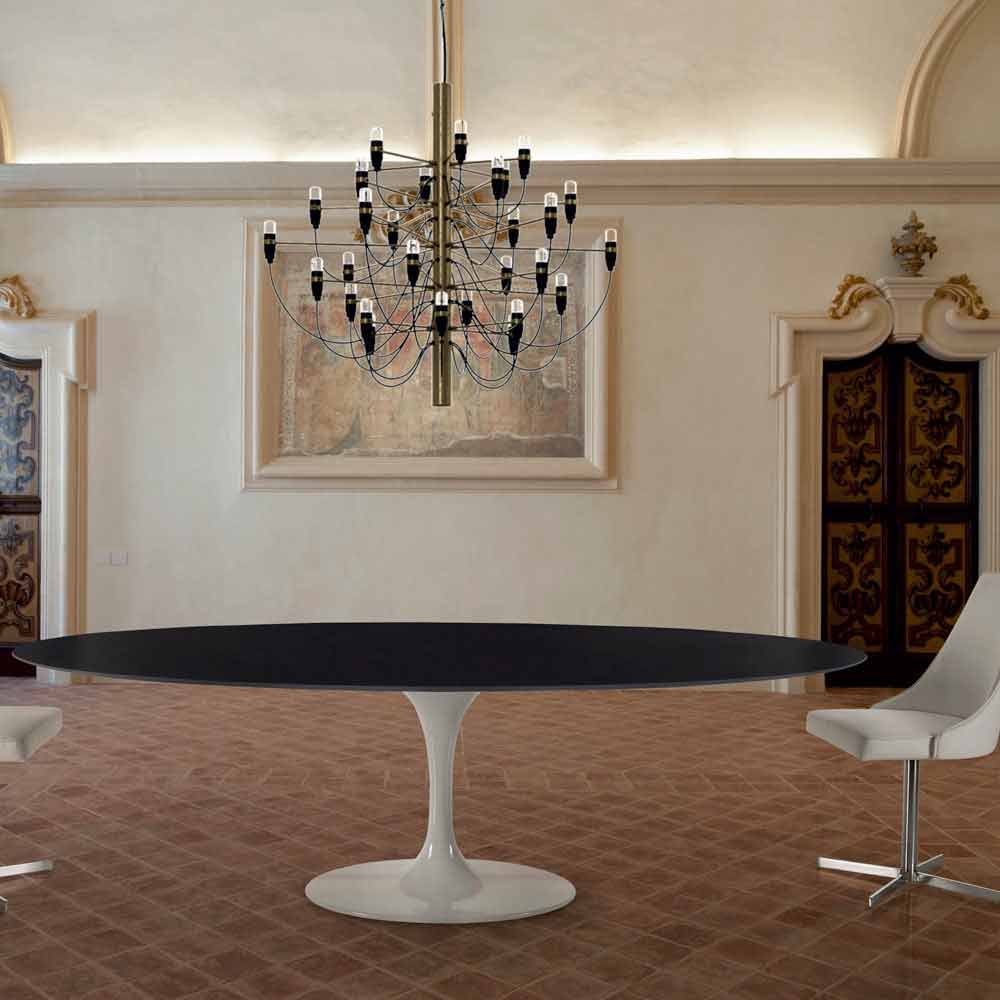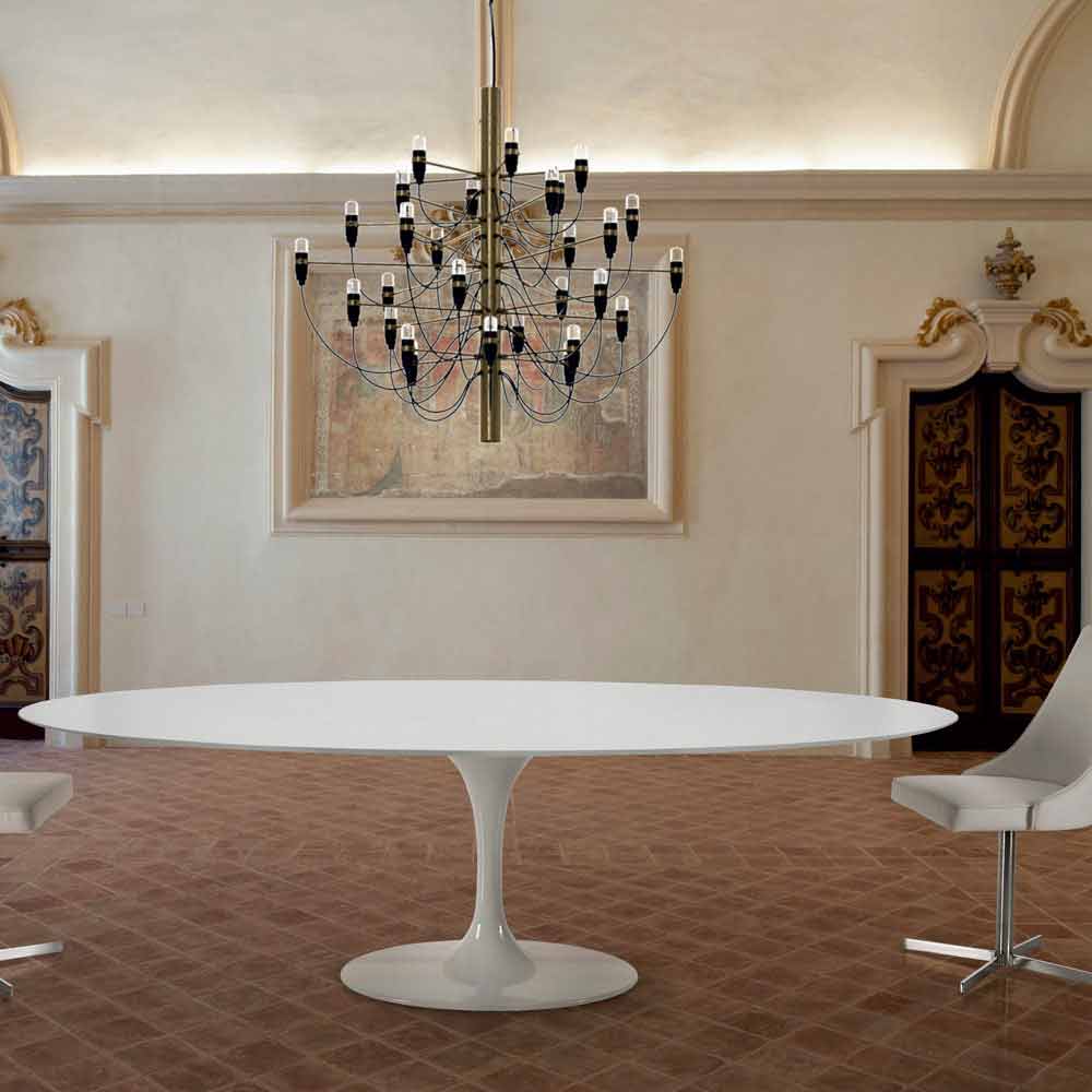 Dining table made in Italy with round top in liquid laminate and base in glossy white lacquered cast aluminium . A furnishing accessory with an exclusive style characterized by an extremely elegant and modern personality and unique features that underline its quality and value. Its refined aesthetic stands out thanks to the original oval shape of the top and the particular shape of the base, which embodies all the uniqueness of this wonderful dining table. Together with the strong visual component, it also presents a strong functional side underlined by the use of quality raw materials which ensure a solid and resistant support surface .