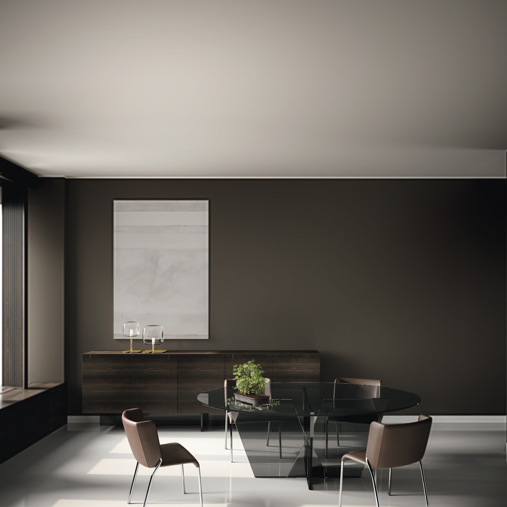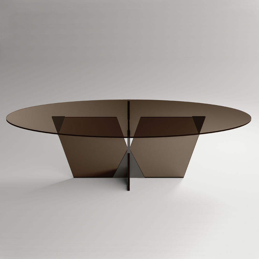 Dining table made in Italy with oval top and glass base. The strong point of its aesthetics is the architectural base characterized by a pyramidal joint made of metal which constitutes the essential part of the product. The metal elements complete the design of the table giving shape to the glass of the base and enriching it with personality and originality.