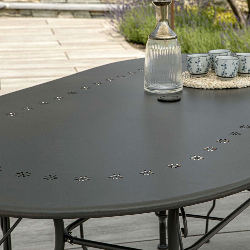 This oval metal table is a perfect choice for those who like to combine practicality and style. With its sturdy frame and elegant, curved legs , it offers an ideal meeting point for convivial moments outdoors.