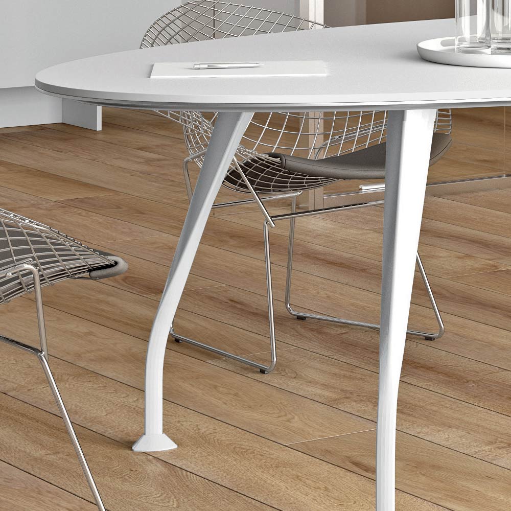This table consists of an oval melamine top in the white finish and 4 Infinity legs, also in the matt white finish.