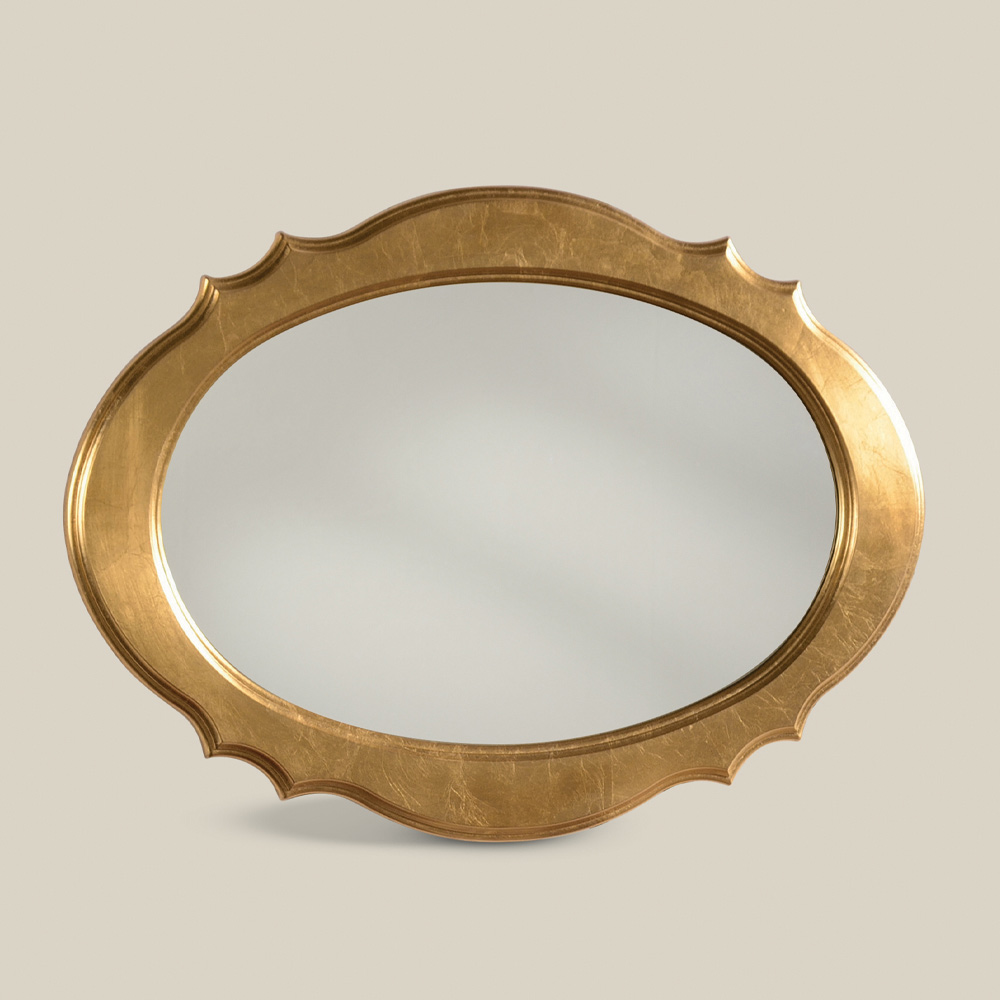 Classic style oval-shaped wall mirror with frame made of wood and decorated with elegant gold leaf , perfect for decorating your living area with personality and taste. A unique and refined complement, completely made in Italy by skilled master craftsmen , masters of art who finish each complement with wisdom and taste for elegance. The production is carried out using fine materials , and performing the work by hand with the utmost care and professionalism that distinguishes Made in Italy products.