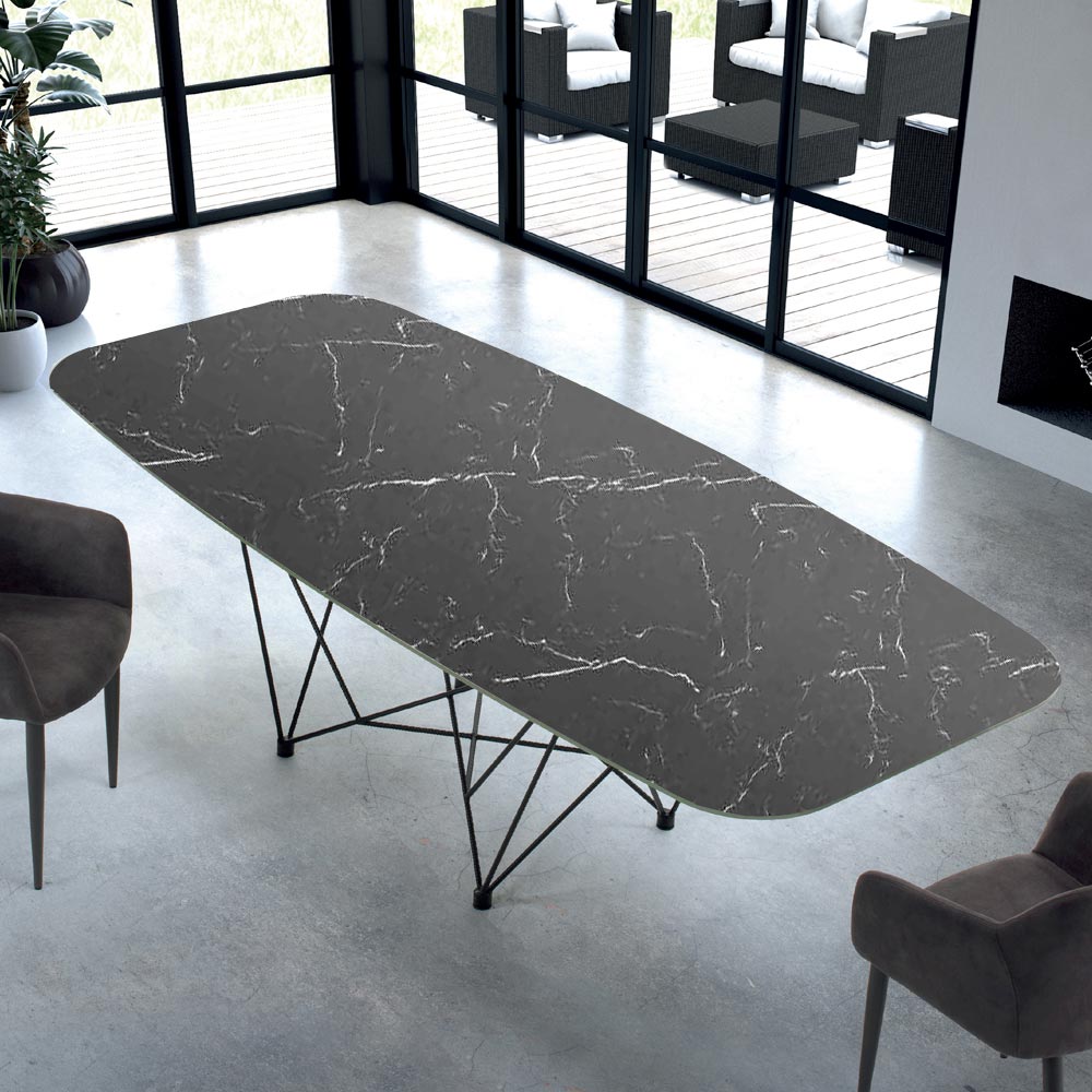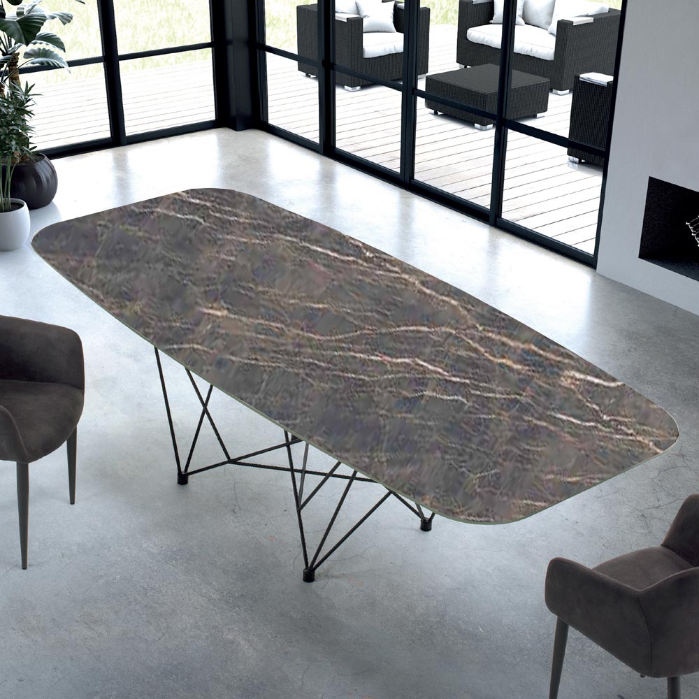 Characterized by a ceramic top obtained from a bevelled glass sheet and a marble-effect ceramic sheet and a black lacquered steel base.