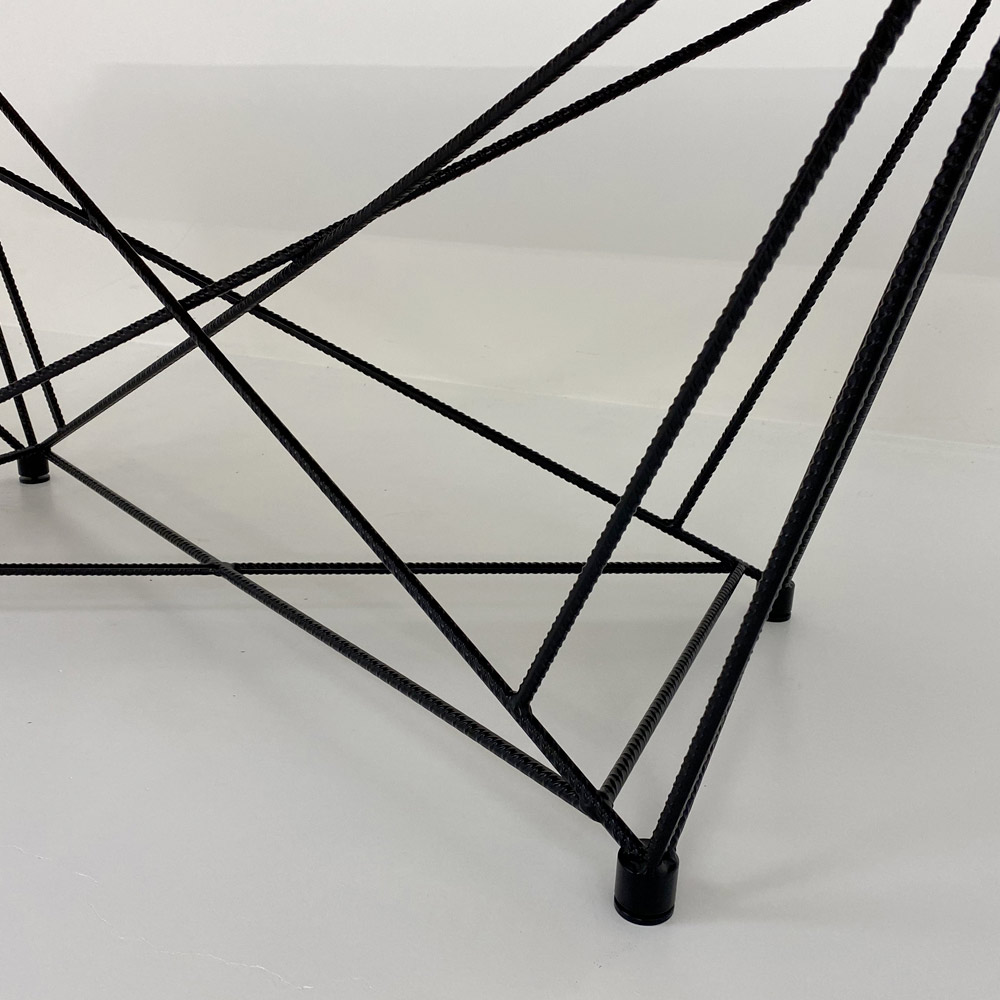 Barrel-shaped table with ceramic top and black steel base produced in Italy.