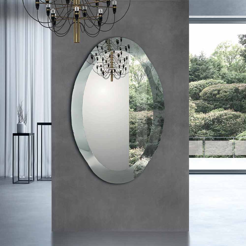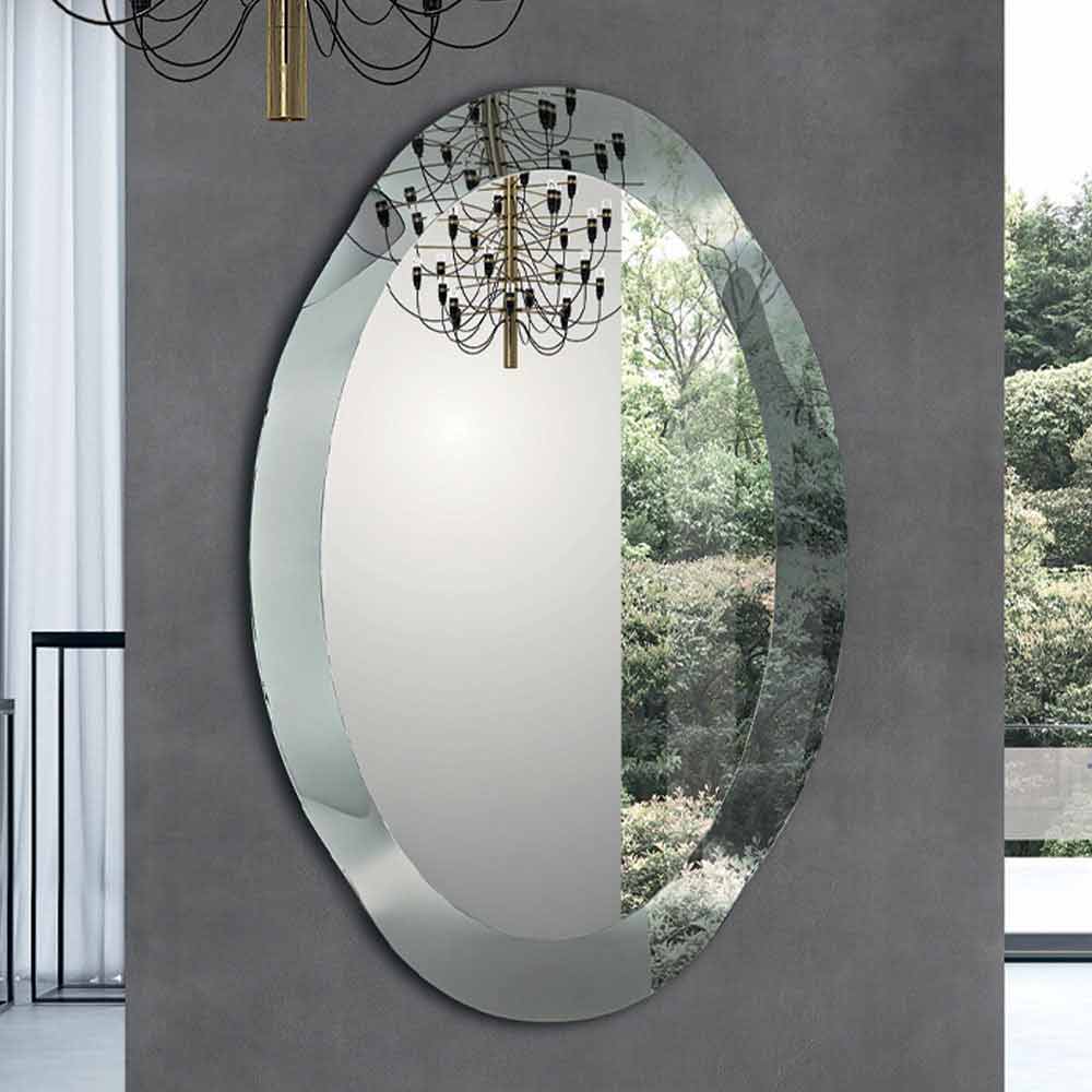 Modern oval mirror with curved crystal effect glass frame Made in Italy.
