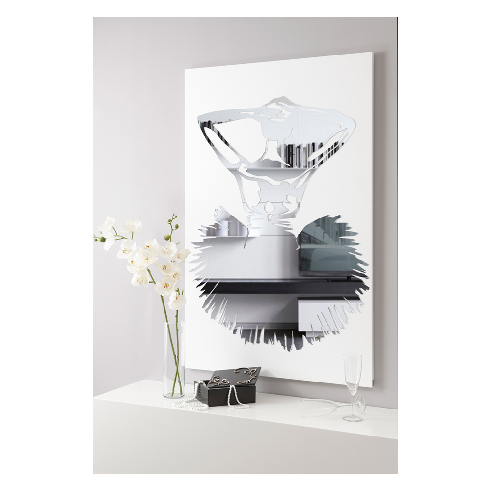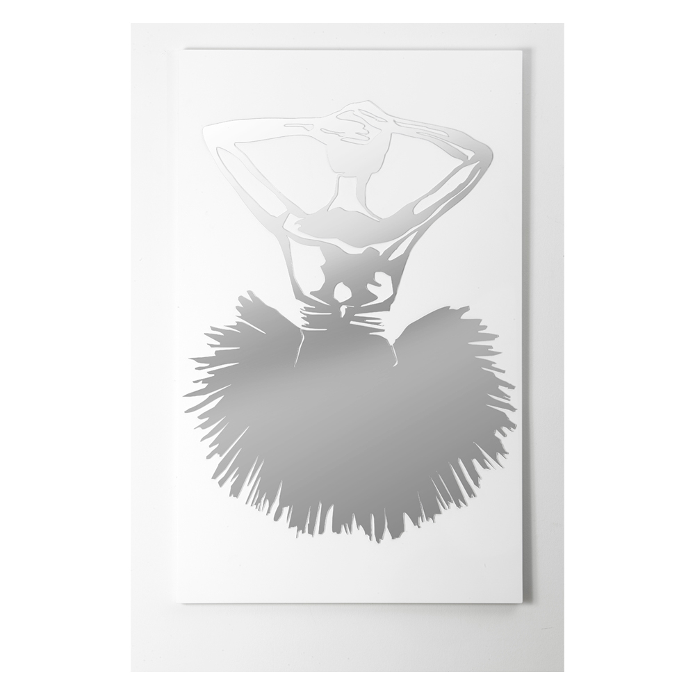 The decorative panel is made using the laser marking technique which creates a bas-relief on the material, creating different gradations of colour. The picture is made of white lacquered wood with mirror decoration. It represents a dancer made on mirror plexiglass in fact it has Ā  also function as a mirror.