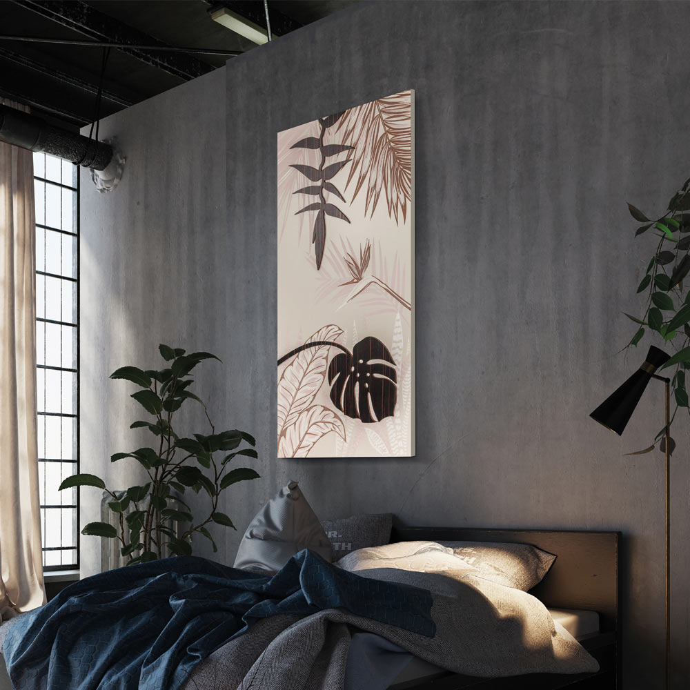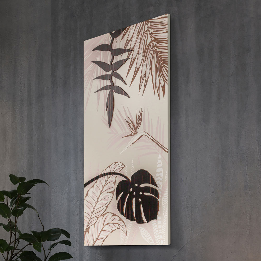 The decorative panel is made using the laser marking technique which creates a bas-relief on the material, creating different colour gradations of the leaves created on the panel. The painting is made of matt sand lacquered wood with applications in ebony wood . The other colours on the panel, such as pink, brown are given by laser marking.