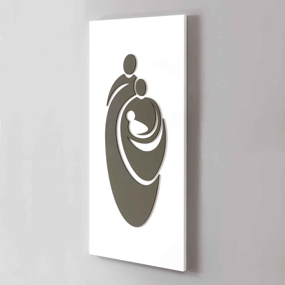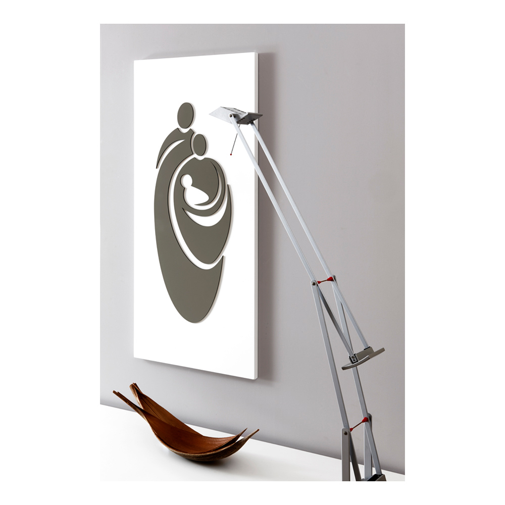 Sacred framework in white lacquered wood with dove grey lacquered wood application of the stylized Holy Family .