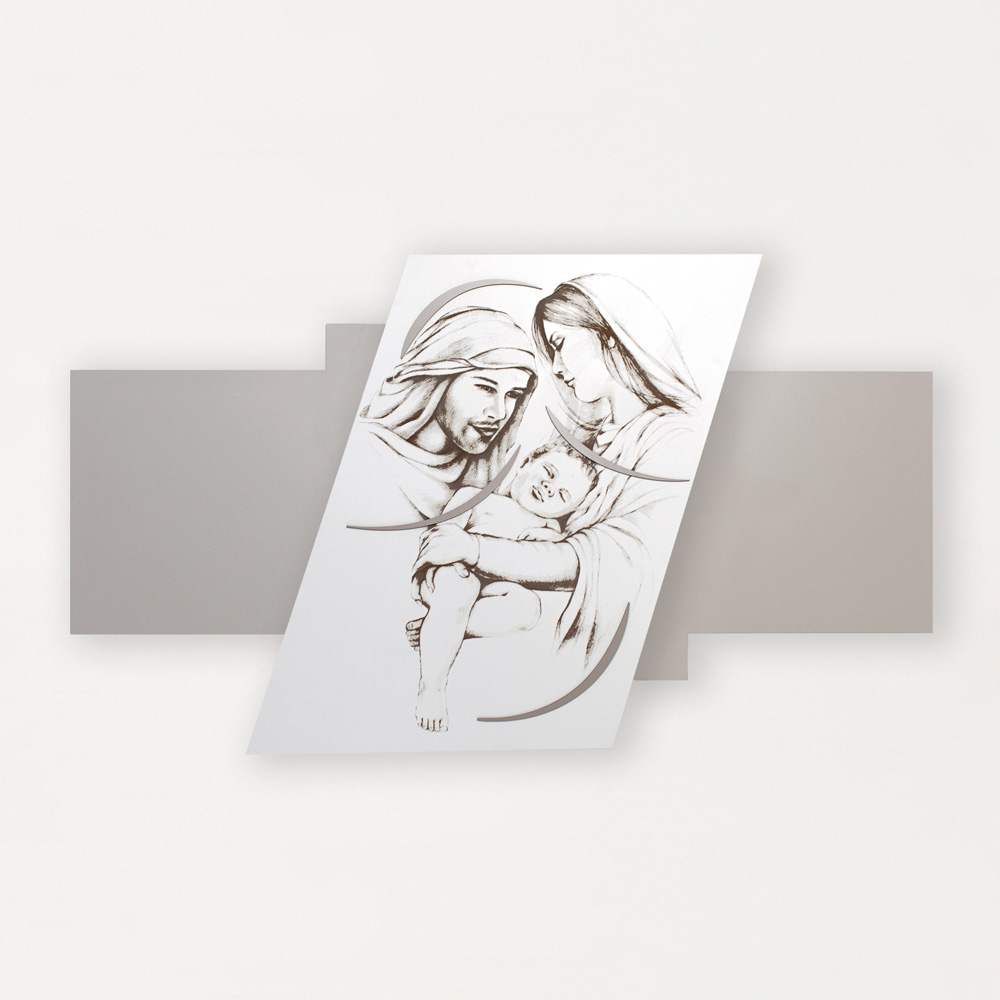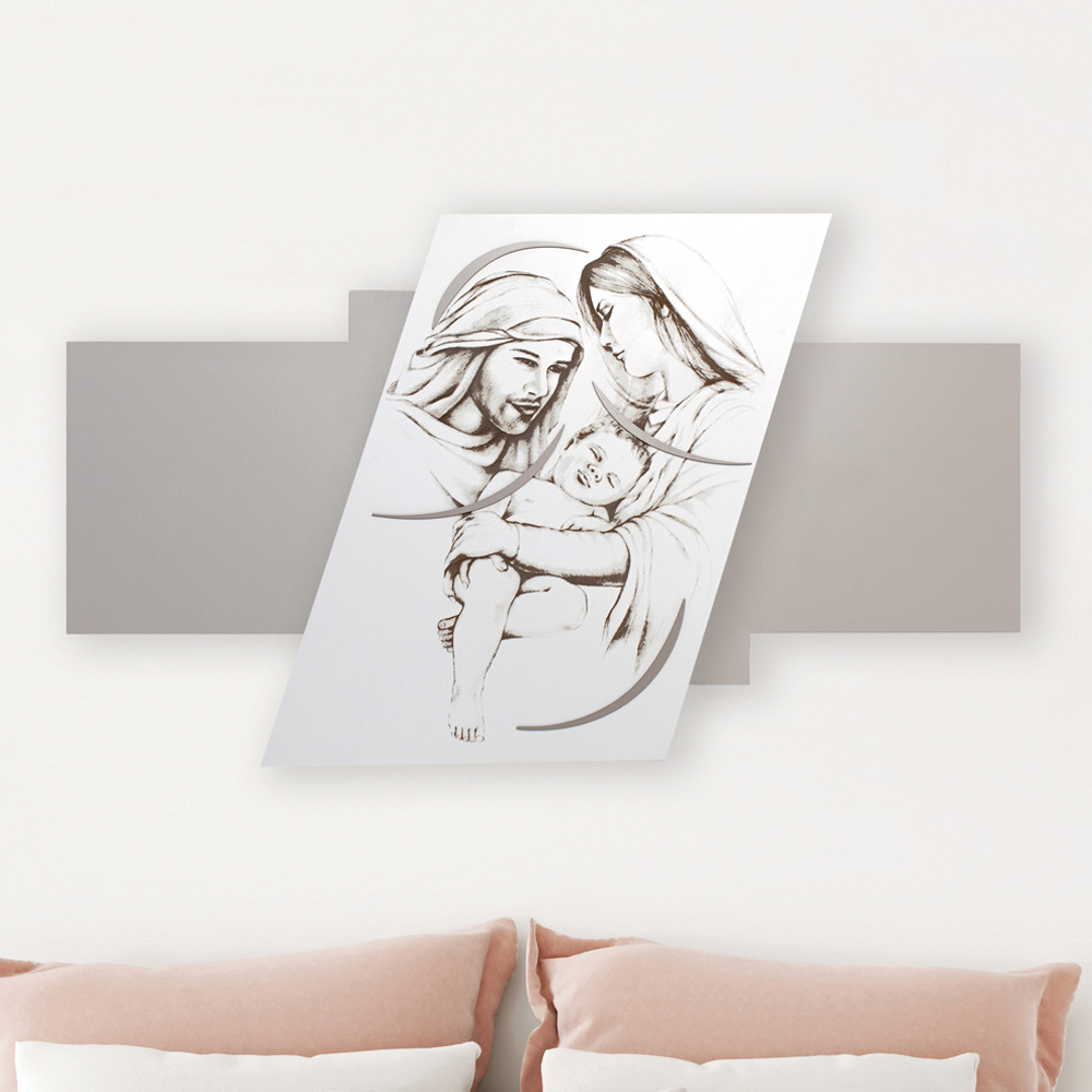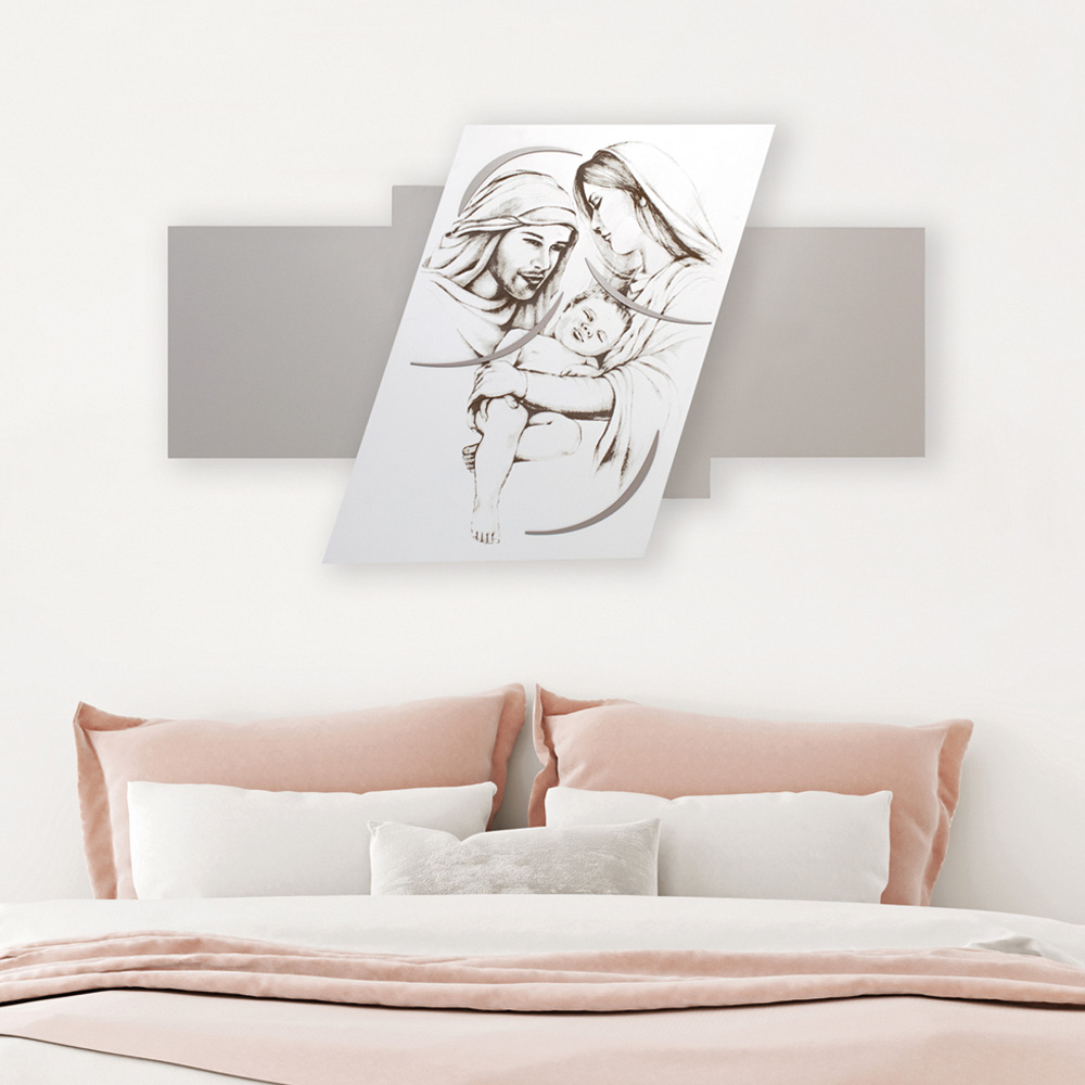 It represents the Holy Family in laser marking, it is a headboard with a minimal design perfect for modern environments. Laser-engraved opaque white lacquered wooden panel on a pebble -colored panel with gravel decorations depicting a religious scene.