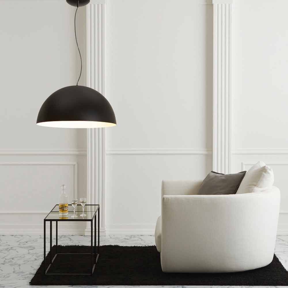 Two-colored pendant lamp in powder-coated steel and decorated by hand. The light spreads homogeneously thanks to its shape and to the white painted interior covering.