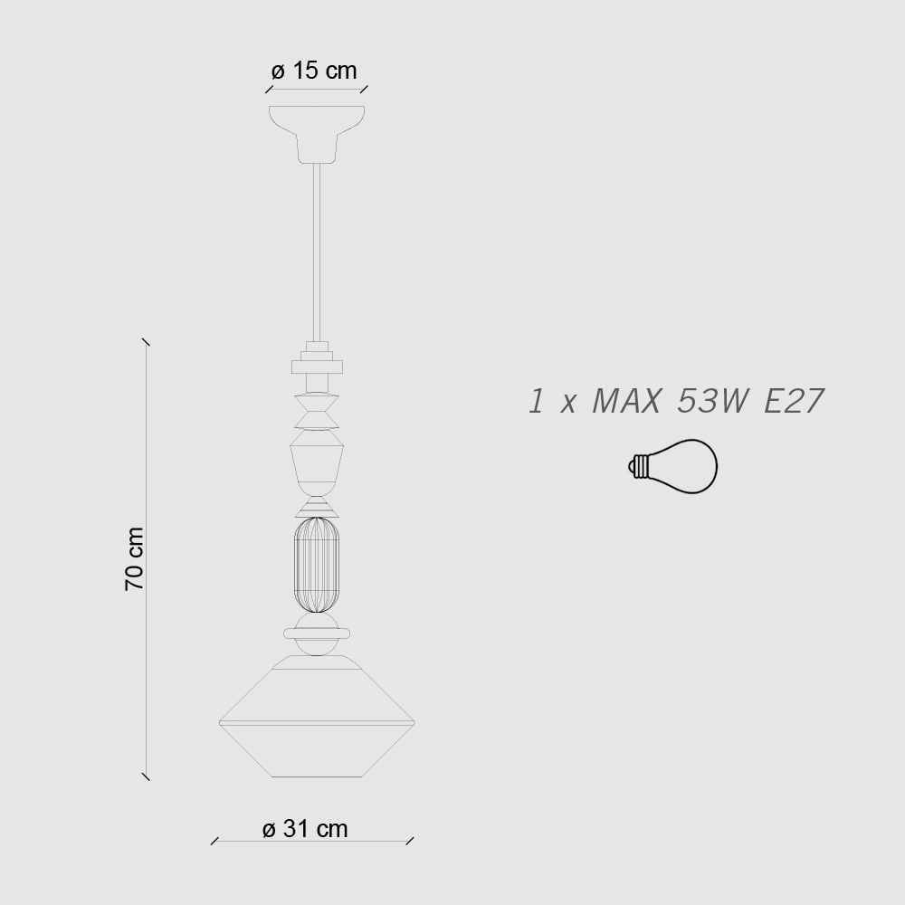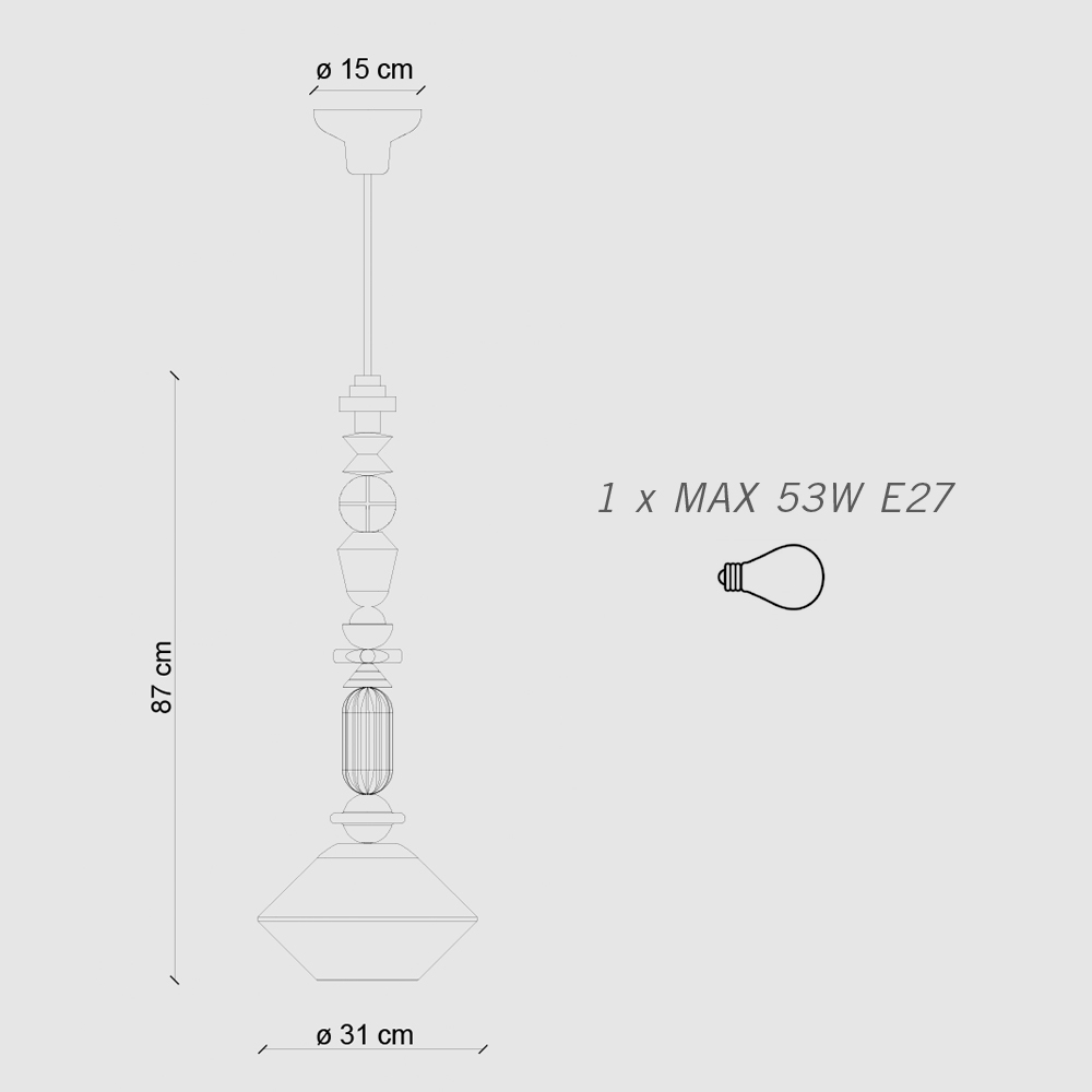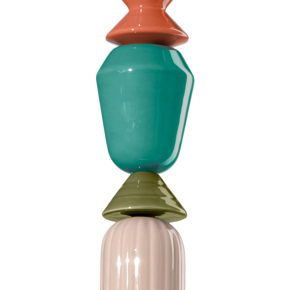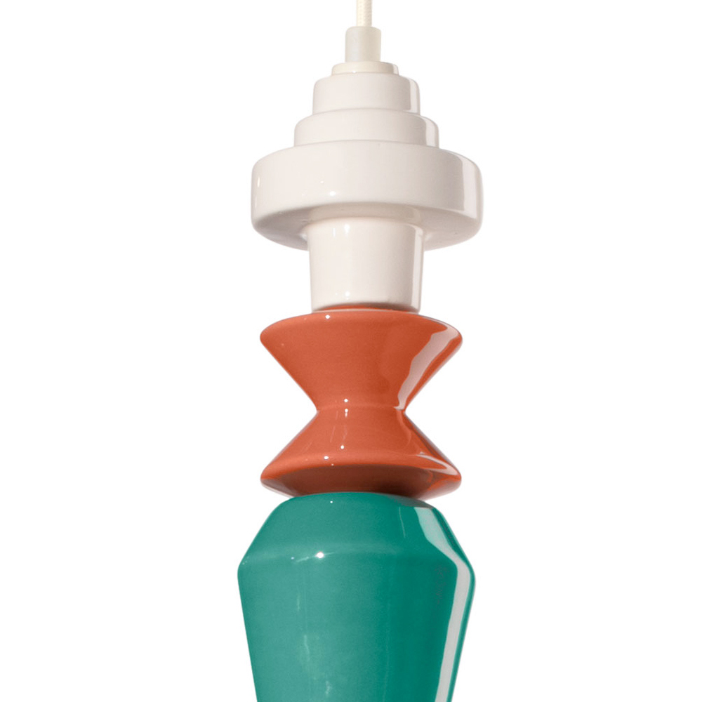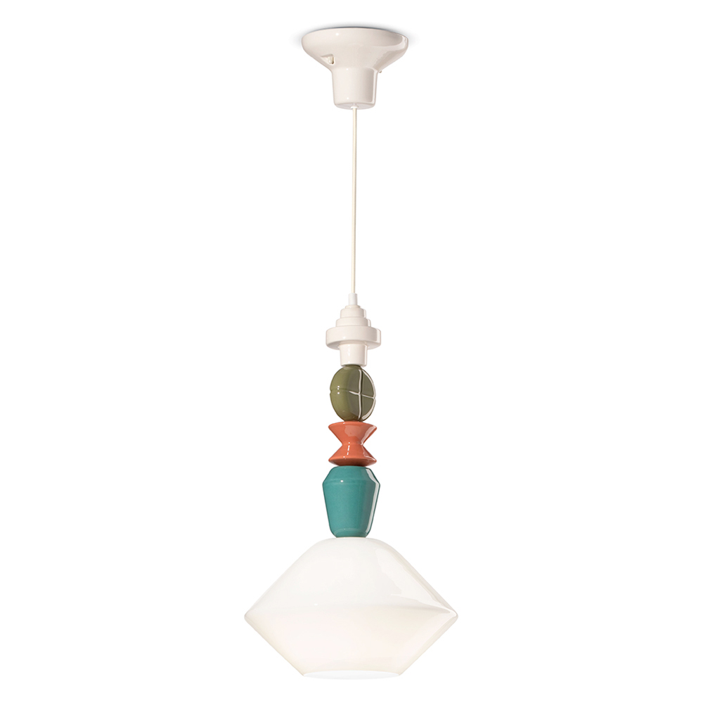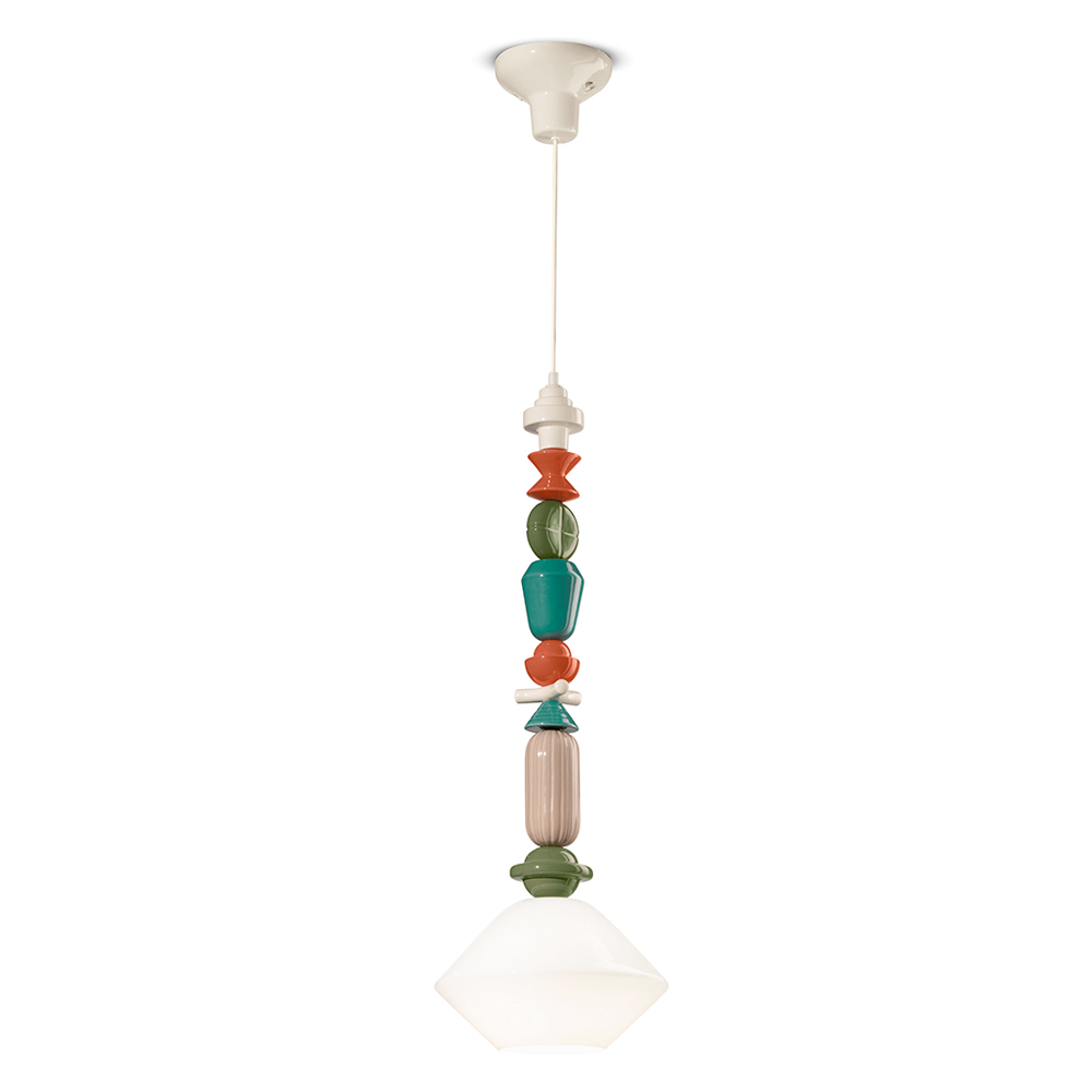 This pendant lamp is an illuminating work of art that combines the warmth of ceramic with the transparency of glass. With its geometric shapes and sequence of colored elements , this furniture is like a totem of light and colour that adds personality and liveliness to any room.