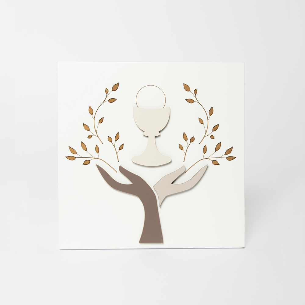 Sacred picture with applied decorations in cocoa lacquered wood, gravel and sand and laser marking of branches and leaves. It represents two hands welcoming the chalice of communion. The painting is in white lacquered wood with a hole for hanging it on the wall and a foot for support.