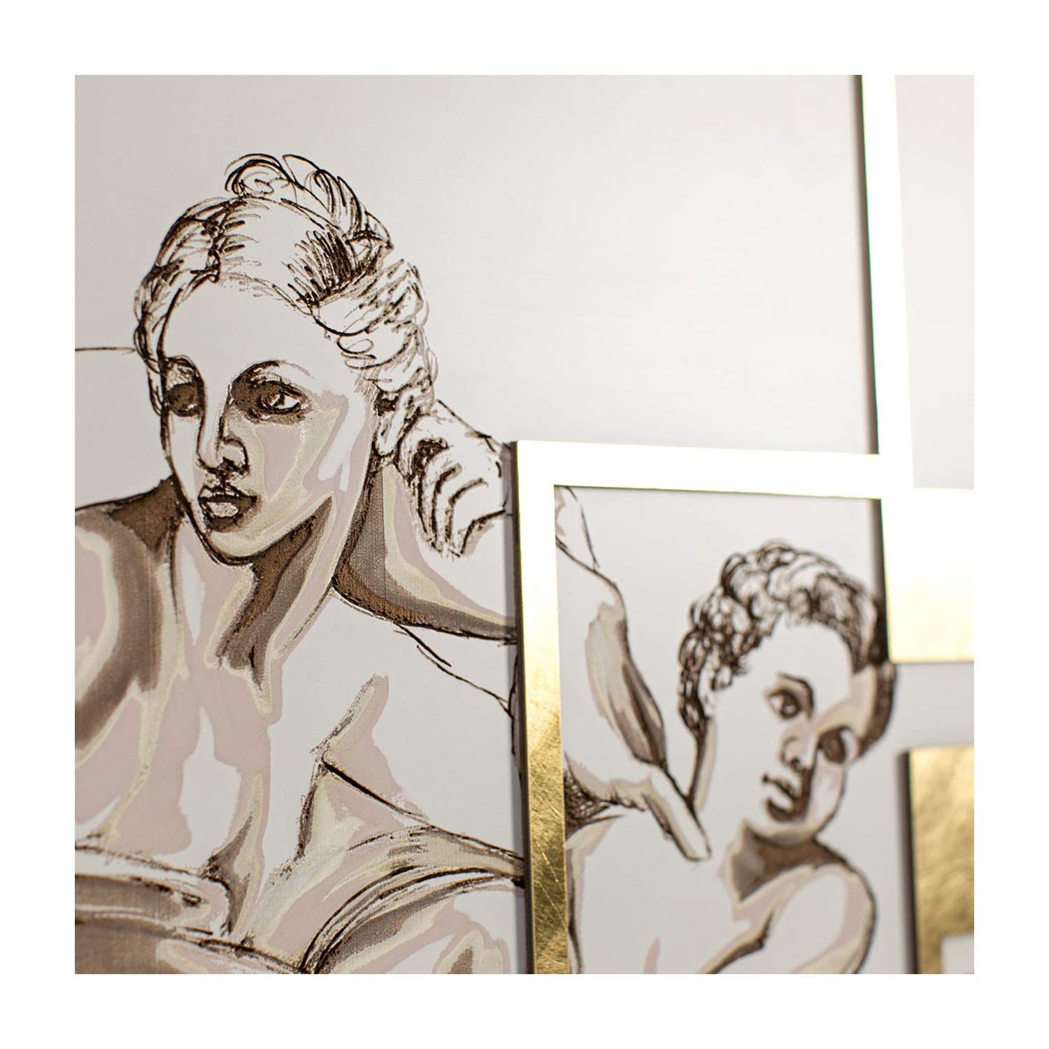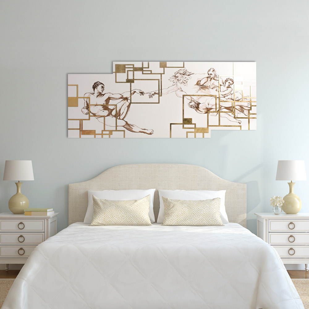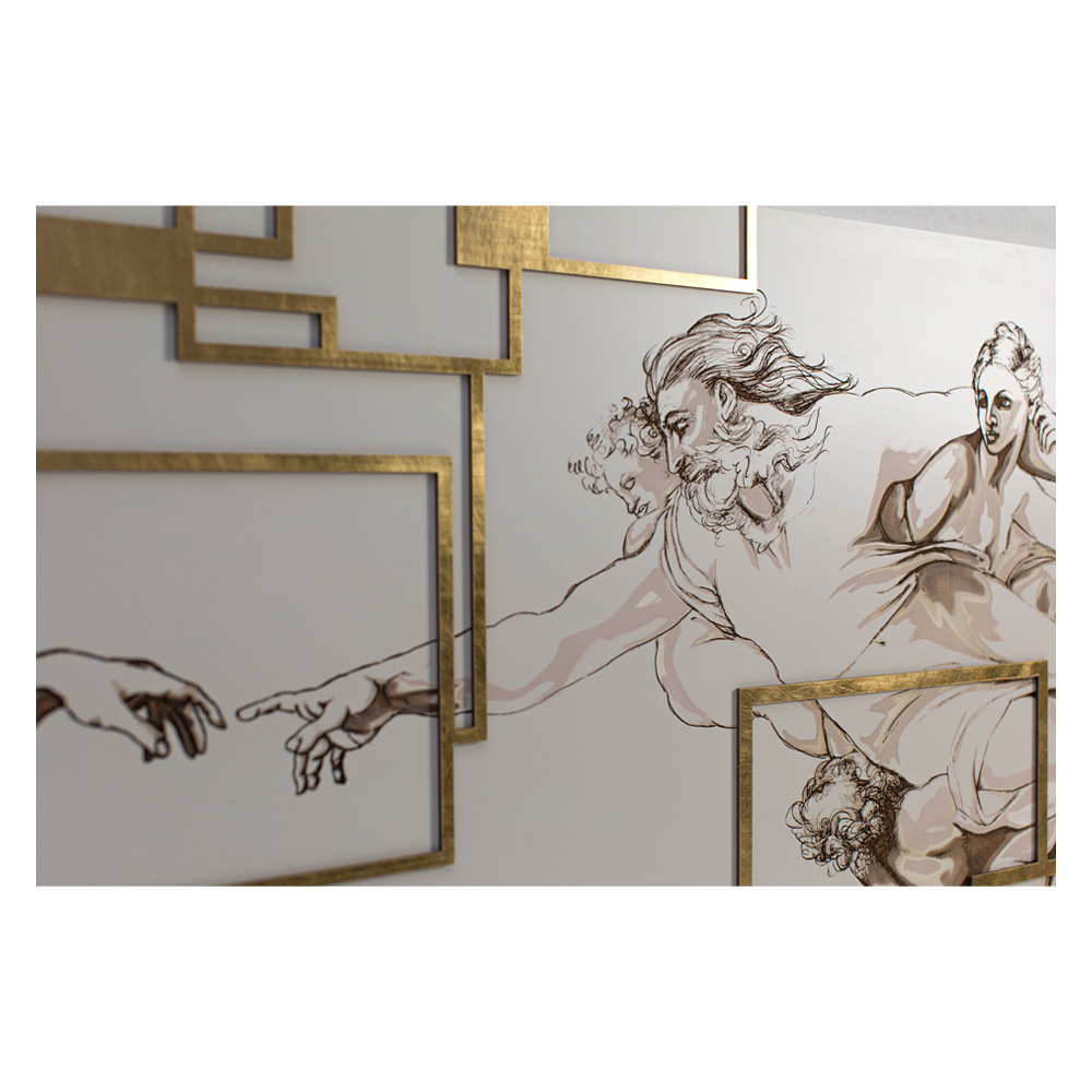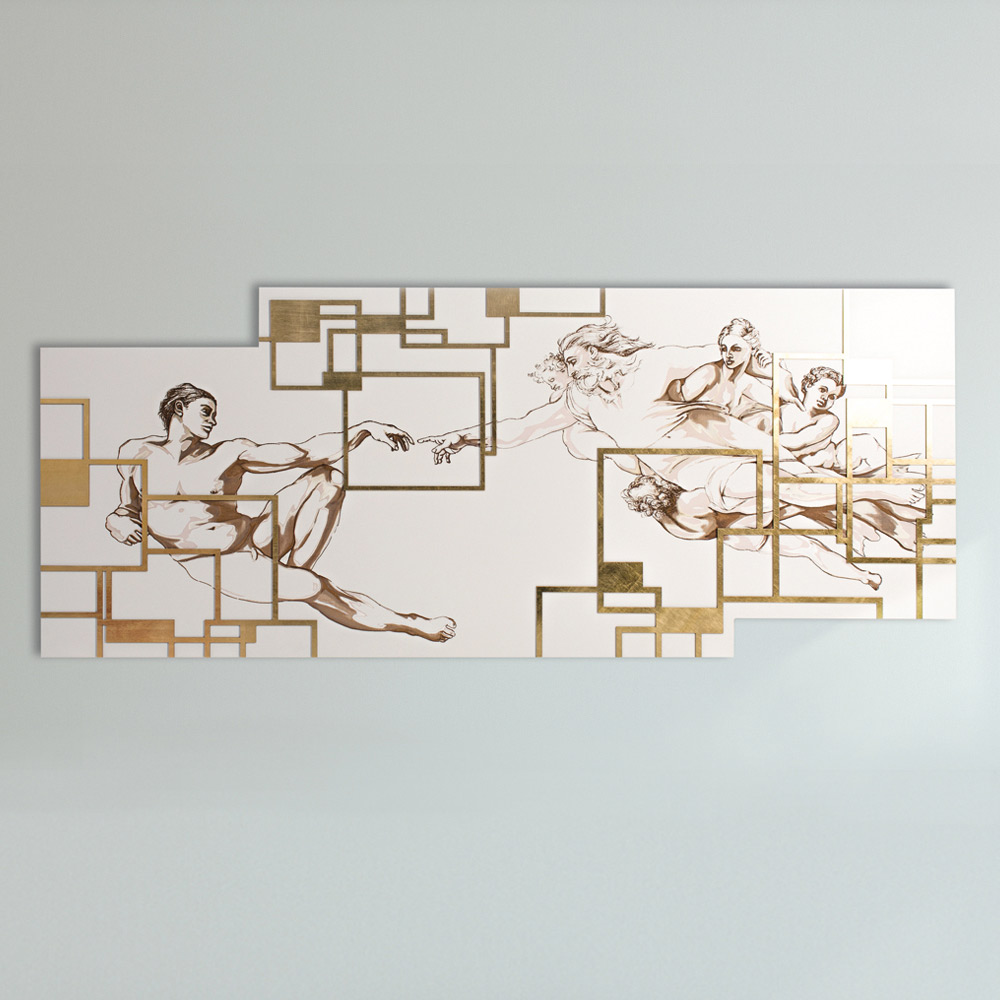 The panel is a unique headboard depicting the centerpiece of Michelangelo 's fresco in the Sistine Chapel, "The Creation of Adam" . The fresco is skilfully reported in the smallest details thanks to the laser marking which creates nuances of colour and depth . Framework in matt white lacquered wood with laser marking, a special technique that creates a bas-relief on the materials.