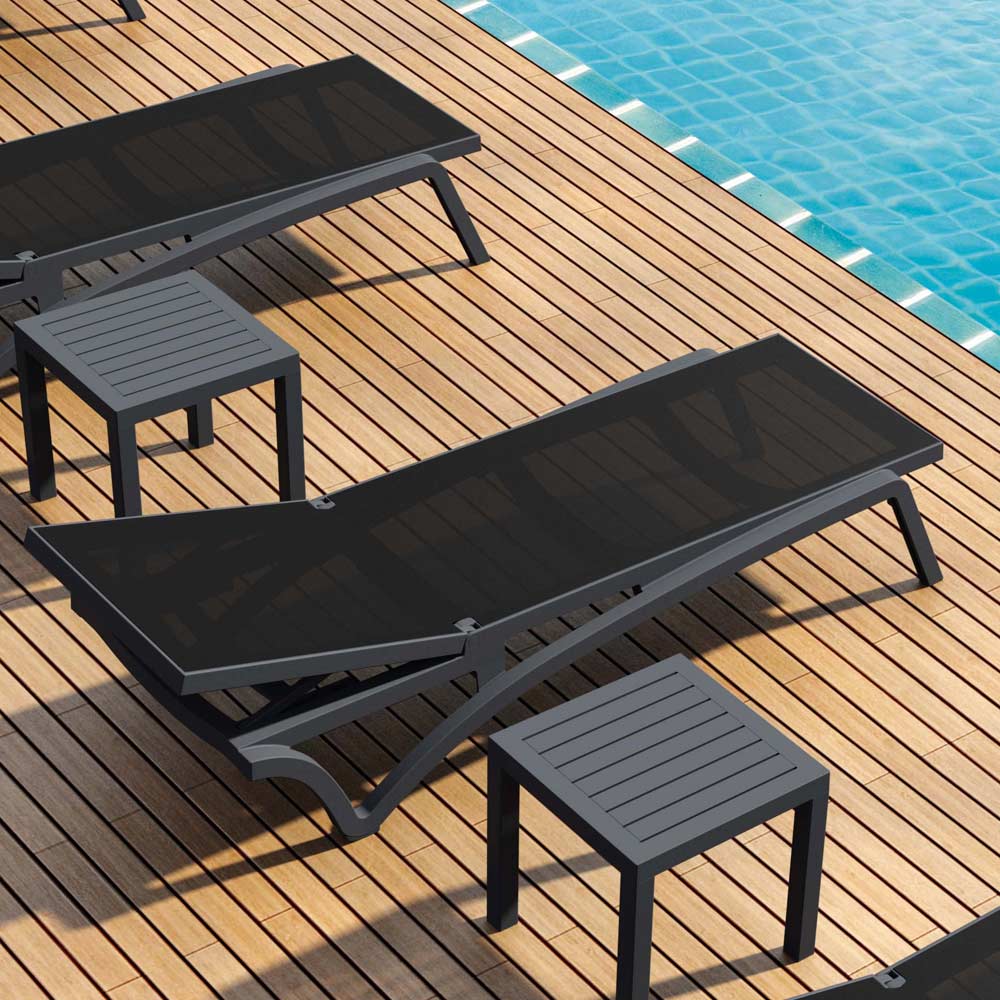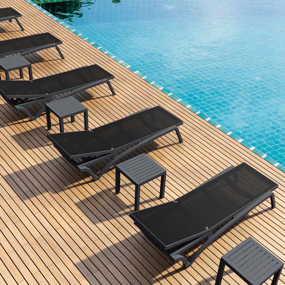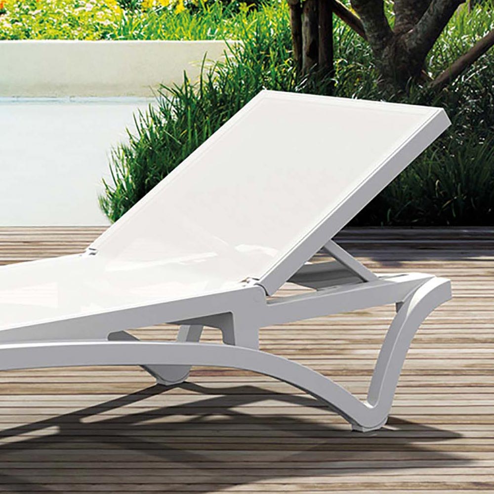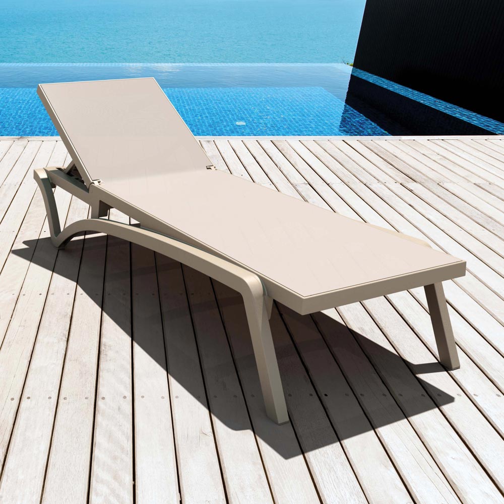 Outdoor sunbed with polypropylene frame combined with colored textilene mesh with reclining backrest up to 5 positions, non-slip feet and wheels.