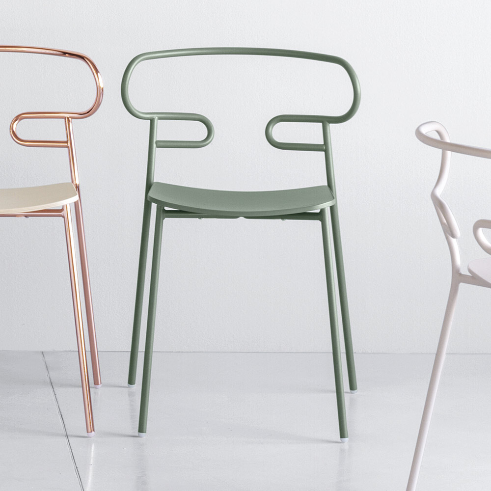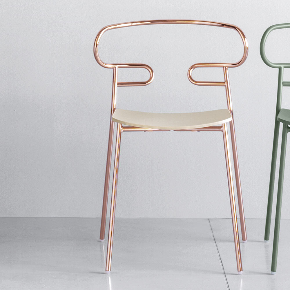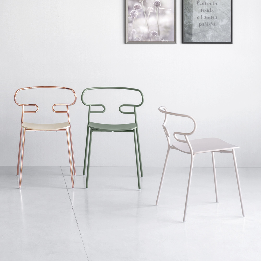 Chair for dining room or kitchen in painted metal with seat in ash wood made in Italy. From the perfect combination of elegance and simplicity comes this design object with extremely essential lines that gives a sense of movement and stands out thanks to the peculiarity of the backrest obtained thanks to the curvature of a single metal tube. This feature increases its originality , thus creating a seat as comfortable as it is aesthetically interesting and unique. Moreover, thanks to the possibility of being stacked, these chairs have an even higher functionality , thus allowing to optimise and organise spaces in the best possible way.