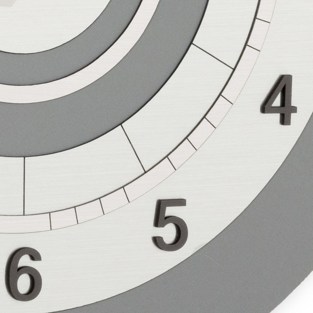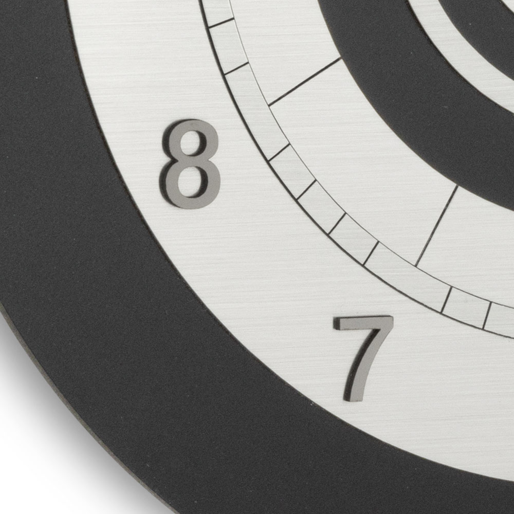 The frameĀ embraces a dialĀ with embossed, elegant and easily readable numerals. The subtle hands and contrasting colours create a balance between modernity and sophistication, perfect for contemporary settings, both domestic and professional.