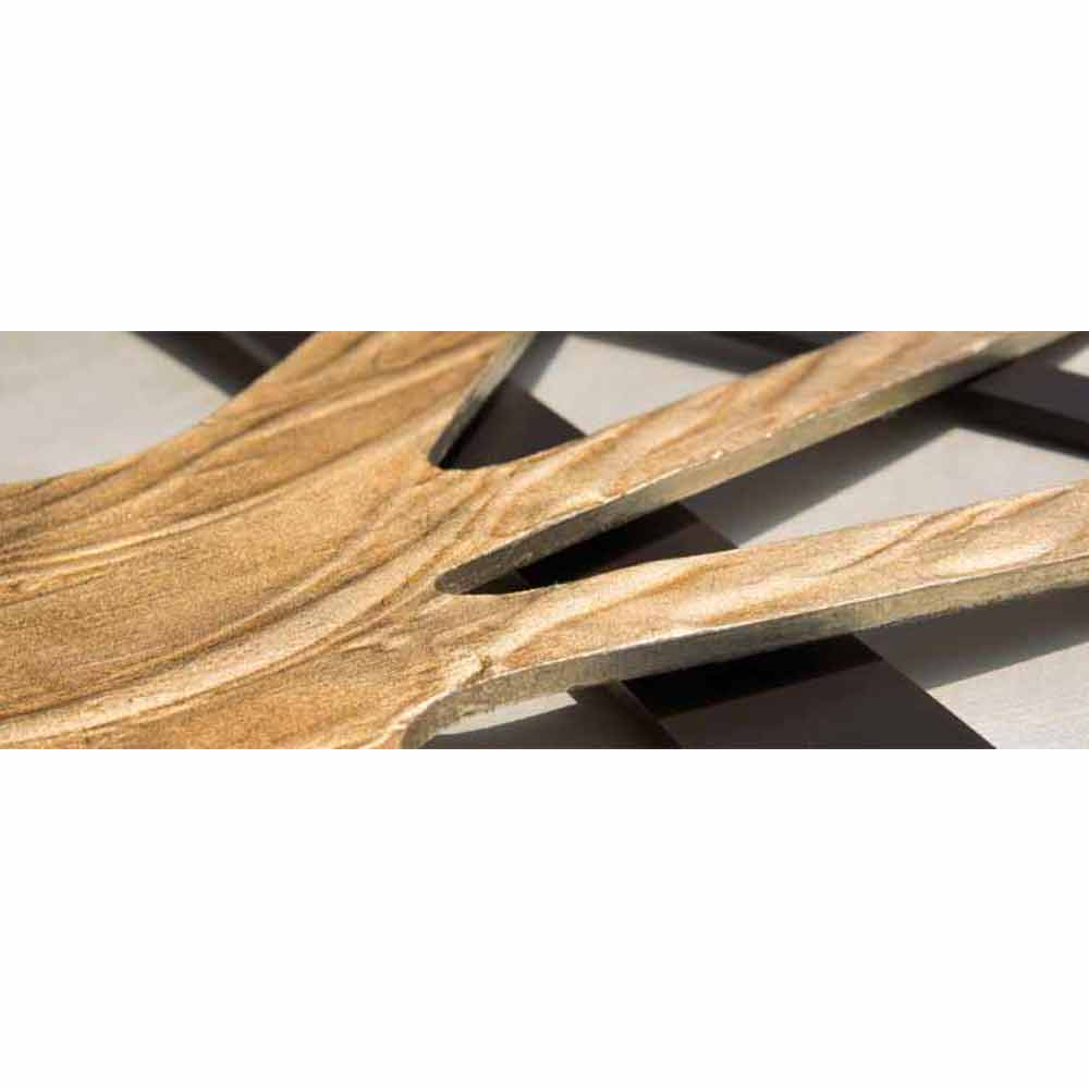 Modern design wall painting. MDF embossed decorations in gold leaf and dark brown lacquer on a panel decorated with a mother of pearl finish.