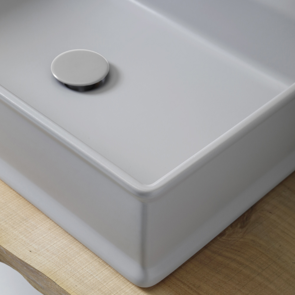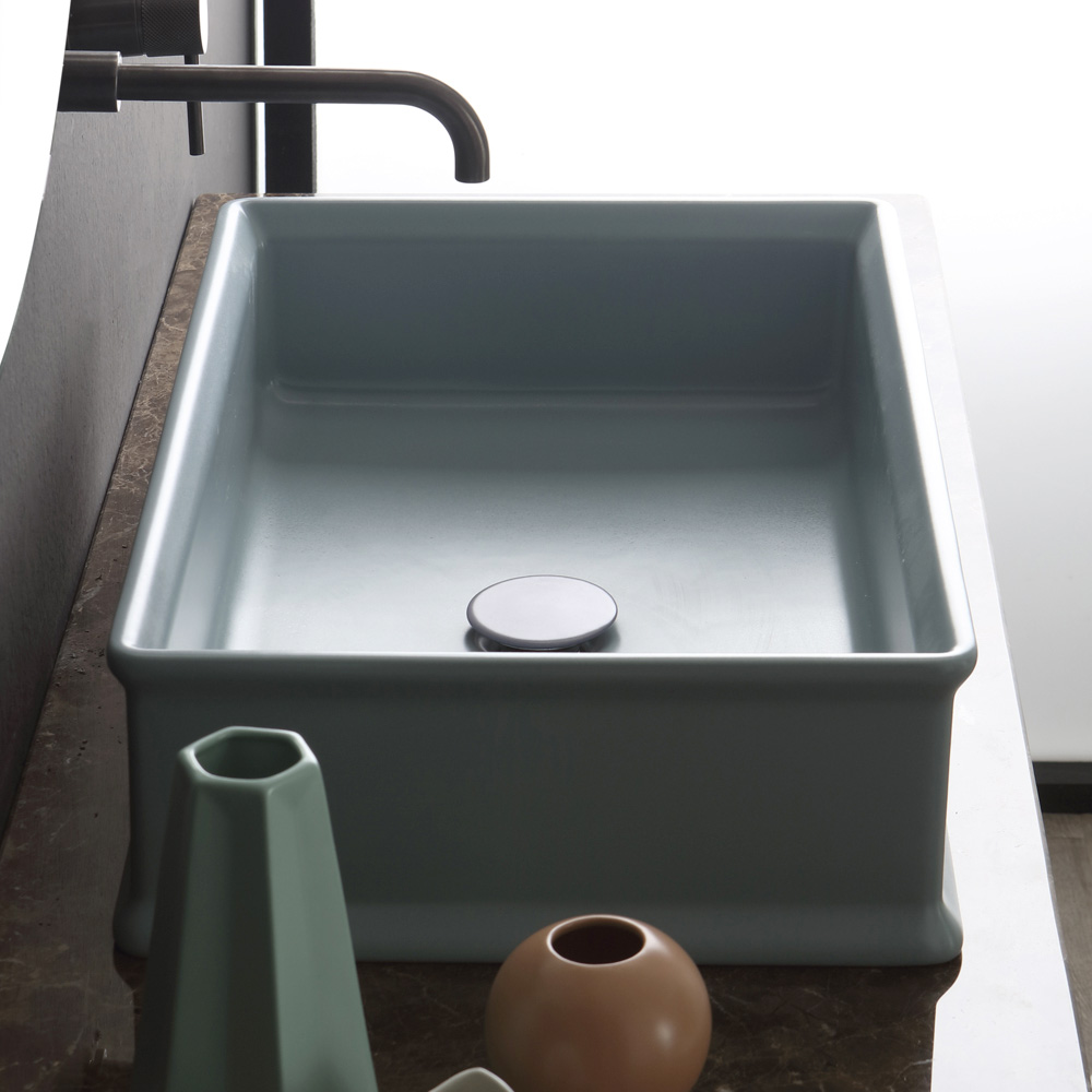 Rectangular countertop washbasin made of opaque colored ceramic through a 100% Made in Italy craftsmanship . A design characterized by strong and imposing queues and features makes this piece of furniture a perfect contemporary reinterpretation of an aesthetic with a retro soul thanks to the use of colour giving life to an exclusive and refined result .