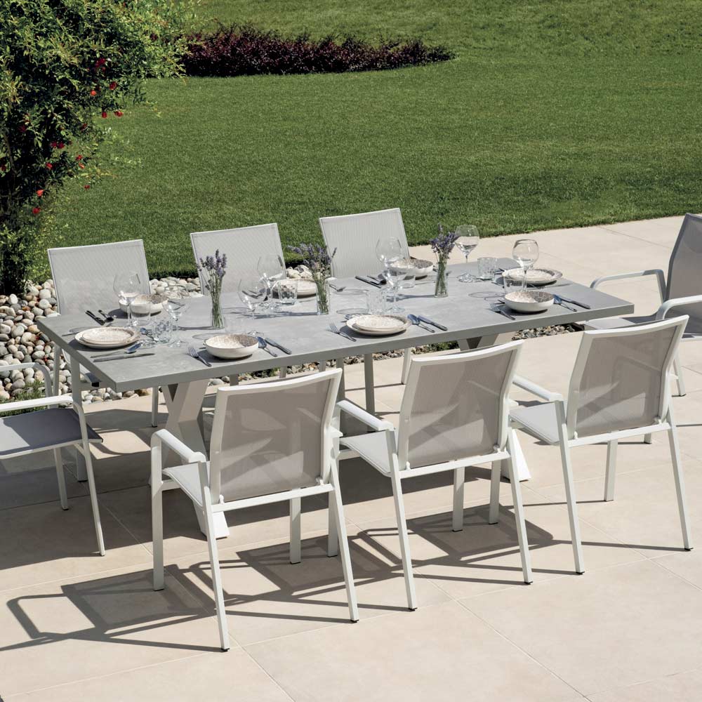 Thanks to its clean lines and neutral color, this table adapts perfectly to different furnishing styles, from modern to industrial, tastefully enhancing gardens, terraces, and verandas.