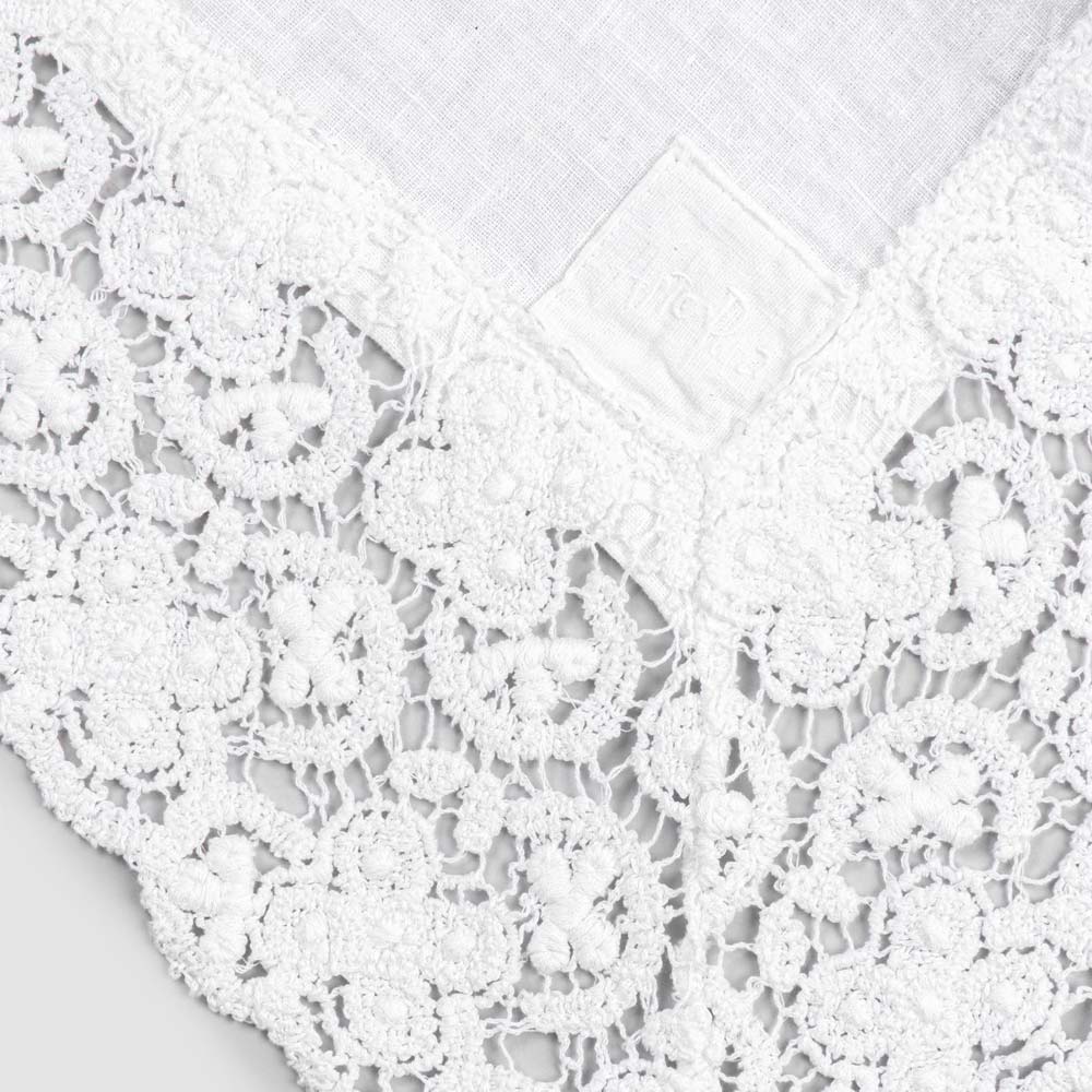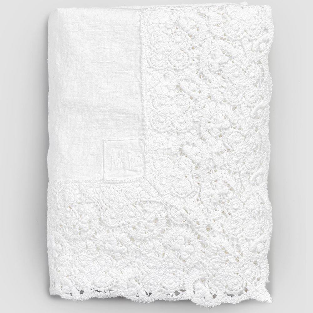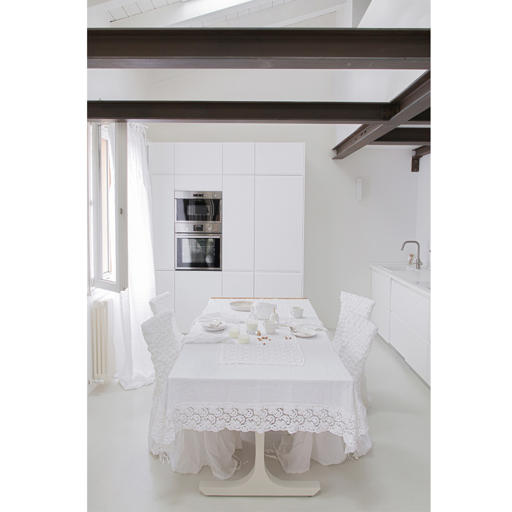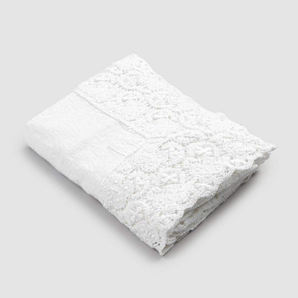 Pure white linen tablecloth with lace, high quality luxury design made in Italy.