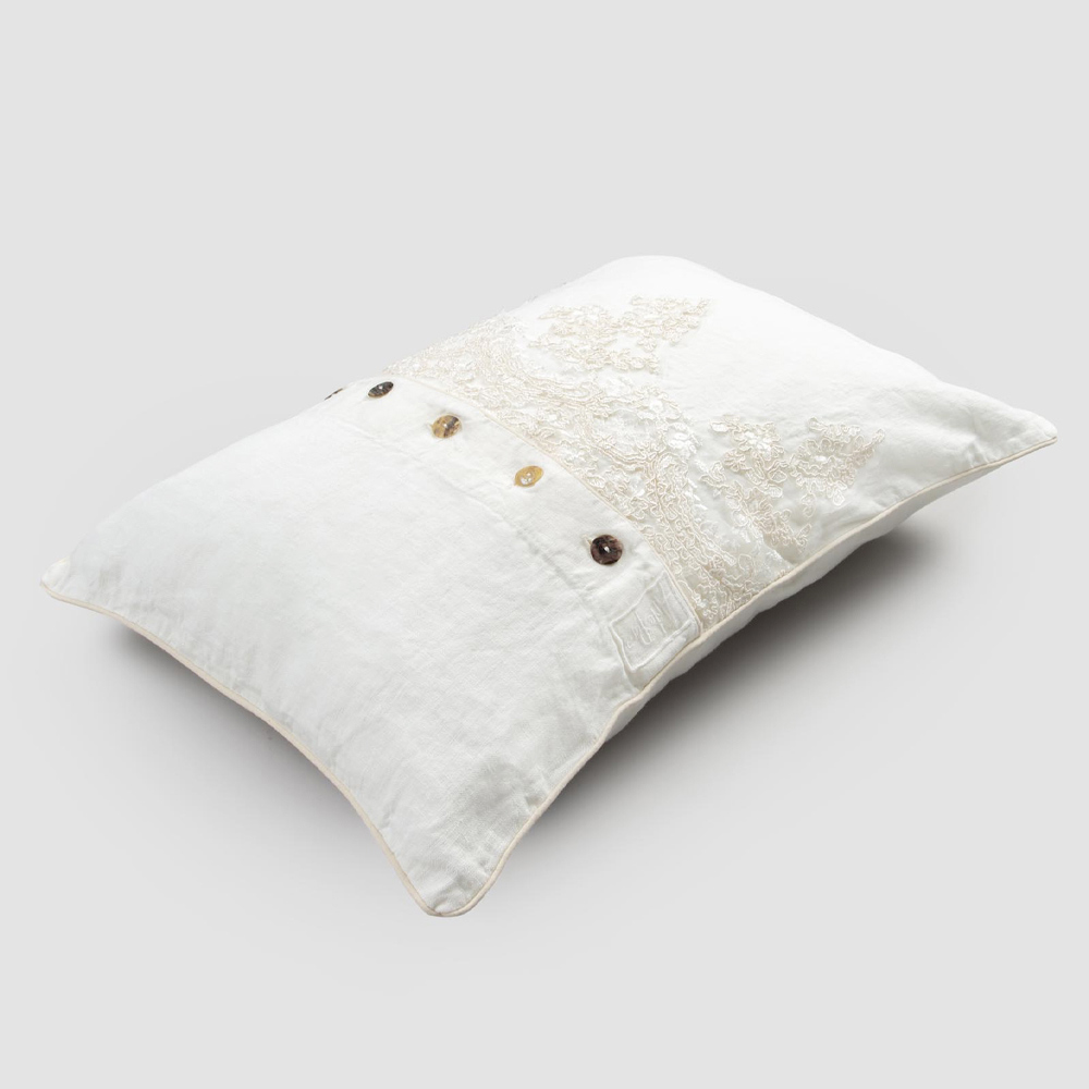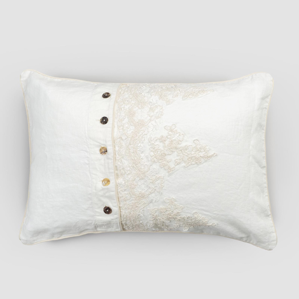 The value of tradition joins the modern lifestyle with this natural white linen pillowcase embellished with a central row of Agoya buttons in mother of pearl and elegant lace , piping profile .