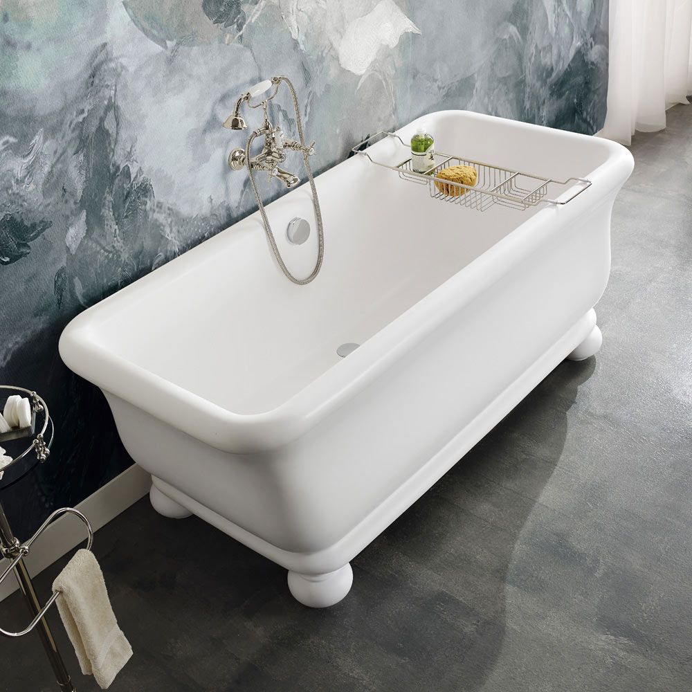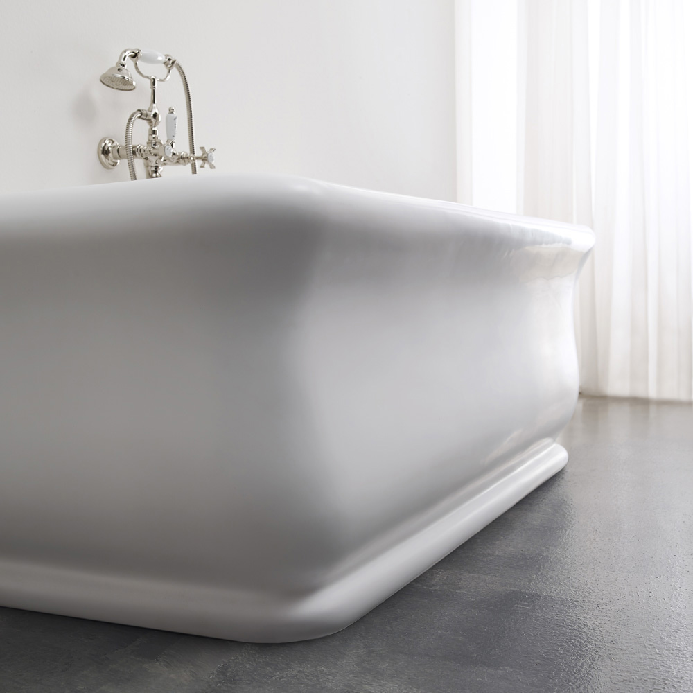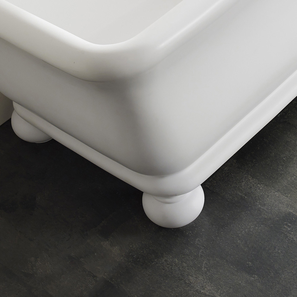 Rectangular white bathtub in Solid Surface, a mixture of acrylic resin modified with mineral compounds, with overflow for waste column. Original 4-foot raised bathtub in optional solid surface . Choice of matt or glossy white.