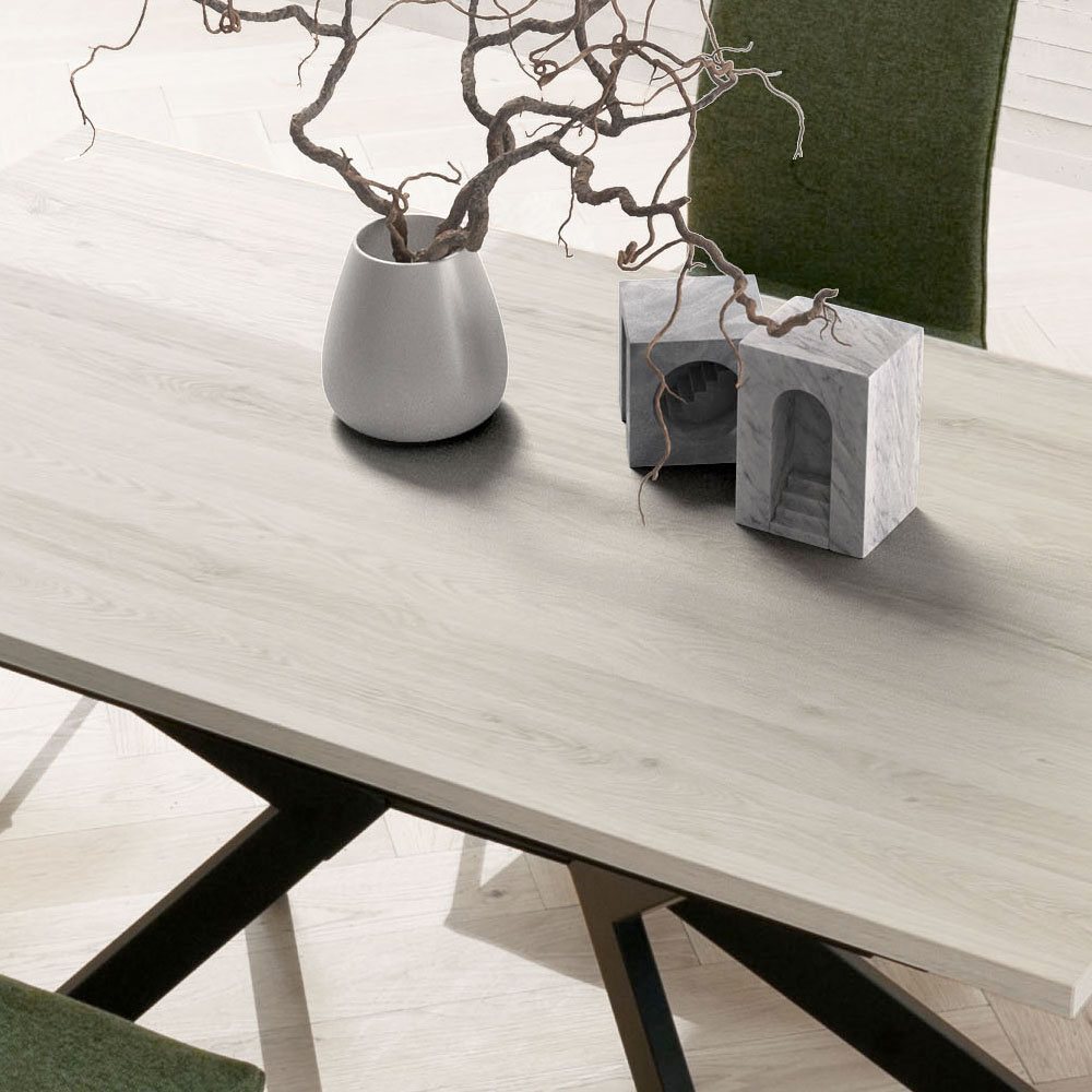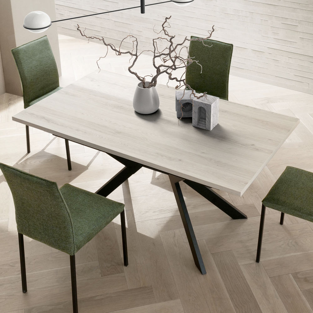 The base, in painted metal and with a crossed geometric design, offers stability and a sculptural touch that does not go unnoticed. A perfect furnishing solution for dining rooms, open spaces or contract environments with a refined style.