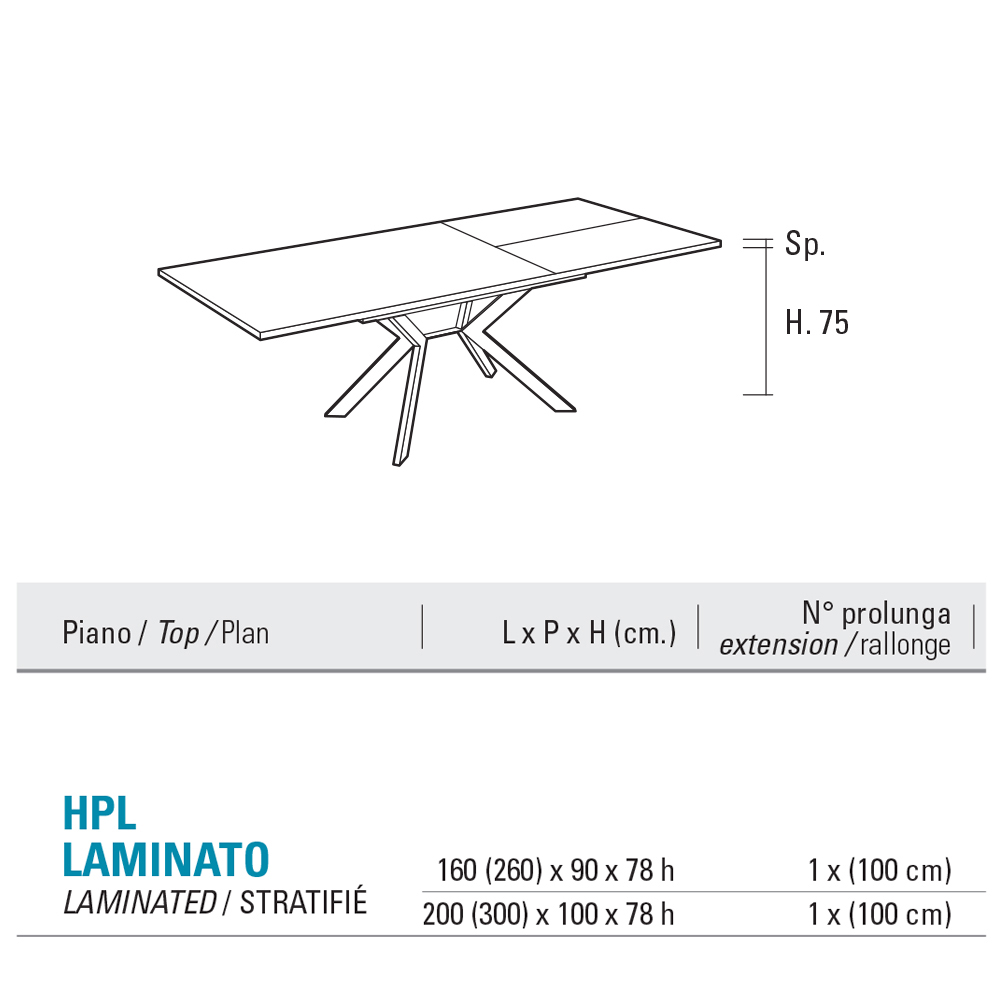 The rectangular HPL top offers a refined and material look, perfect for modern environments. The surface is resistant , ideal for daily use without sacrificing aesthetics. The integrated extension system allows you to easily extend the table, making it perfect for welcoming chinas and family on any occasion.