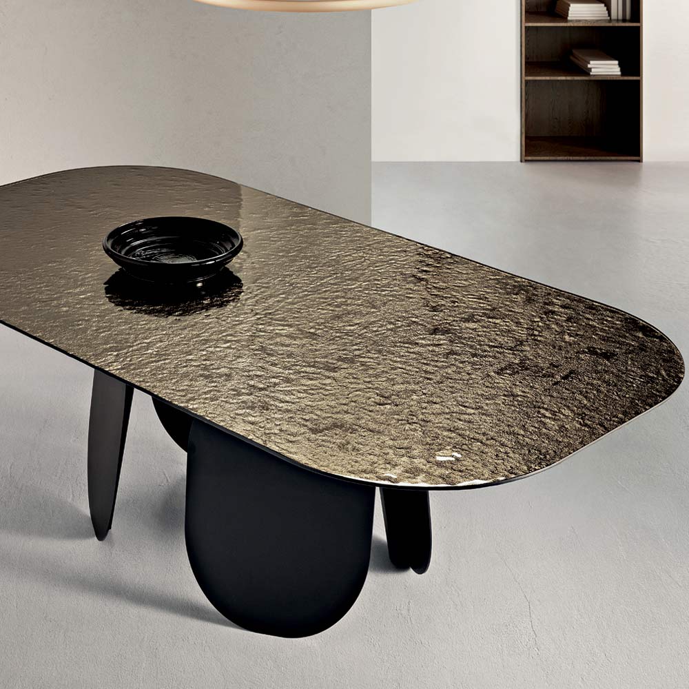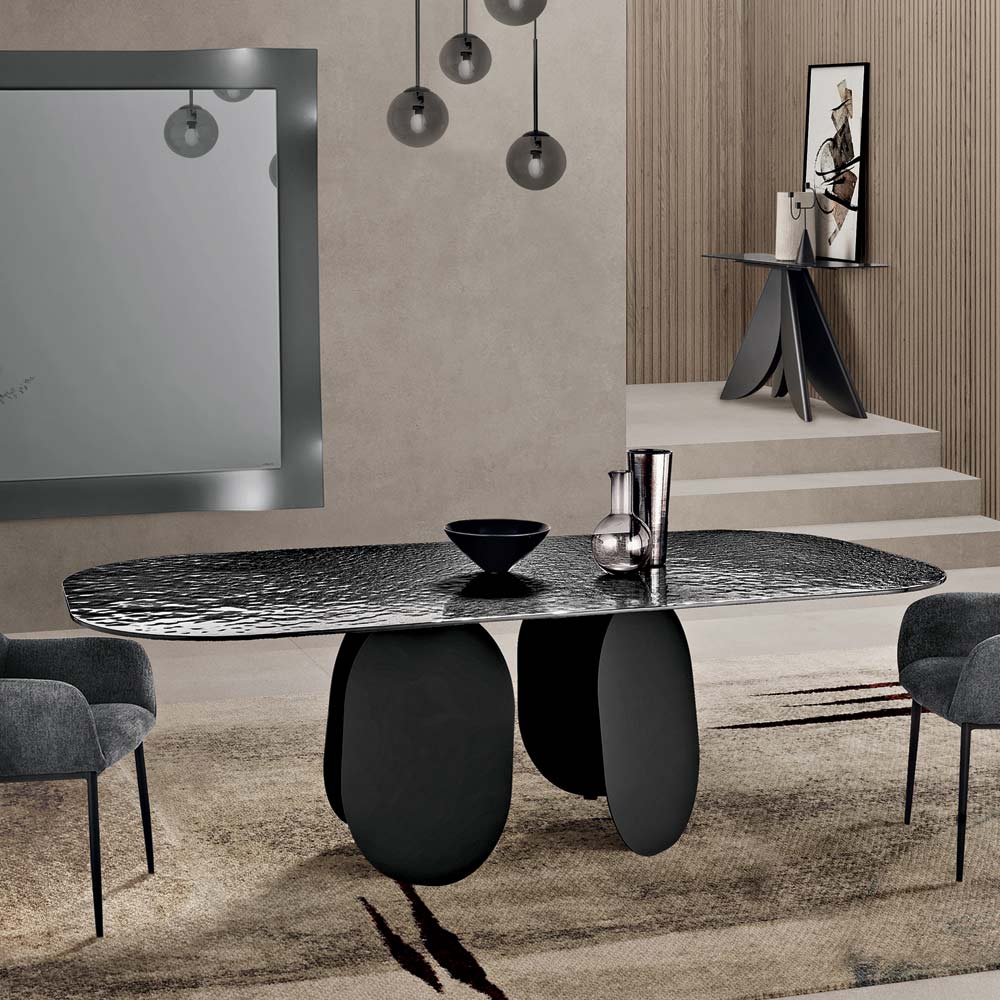 The back-silvered hammered glass top adds brightness and visual depth thanks to its textured surface that reflects light with iridescent effects. The rounded corners of the top soften the table's profile, making it more welcoming and perfect for convivial moments.