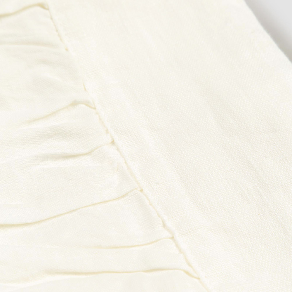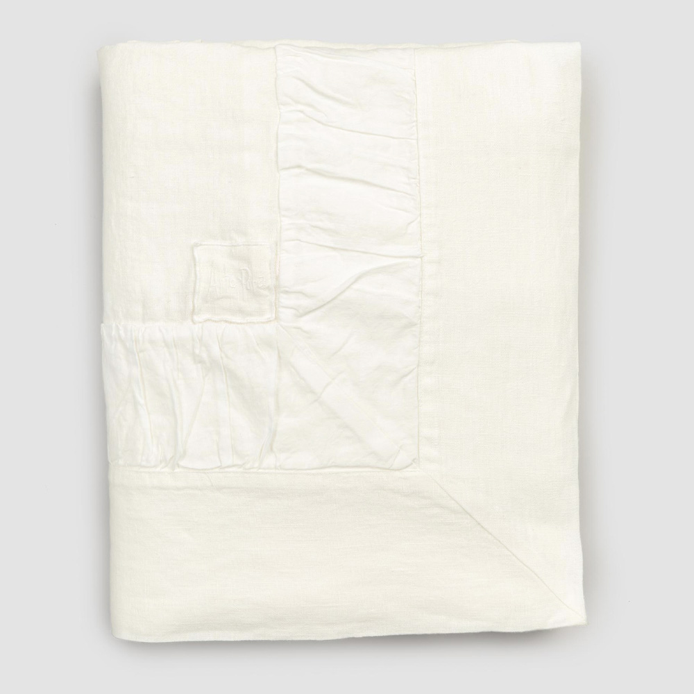 Rectangular white linen tablecloth with embossing and folded edge, made in Italy.