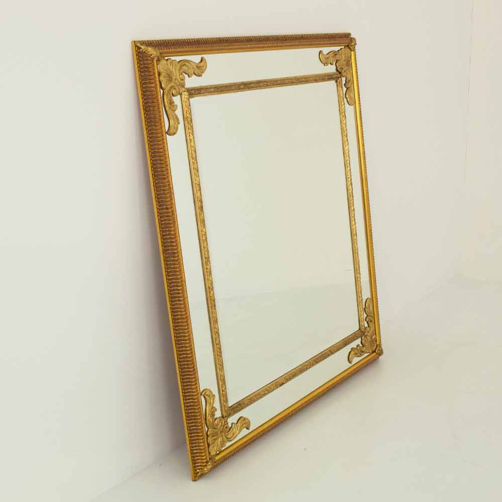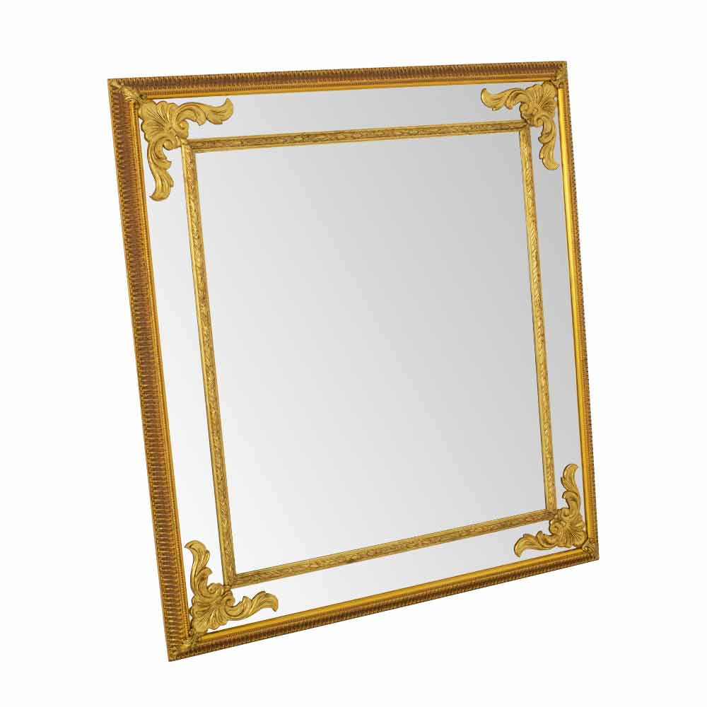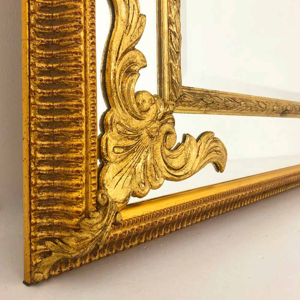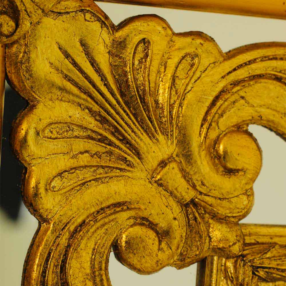 This splendid mirror is a triumph of classic elegance , a true jewel for the home that combines functionality with pure aesthetic splendor . Its rich and intricate design captures the essence of luxury, with every scroll and carving shining with finely applied gilding, harking back to the opulence of historic Italian homes.