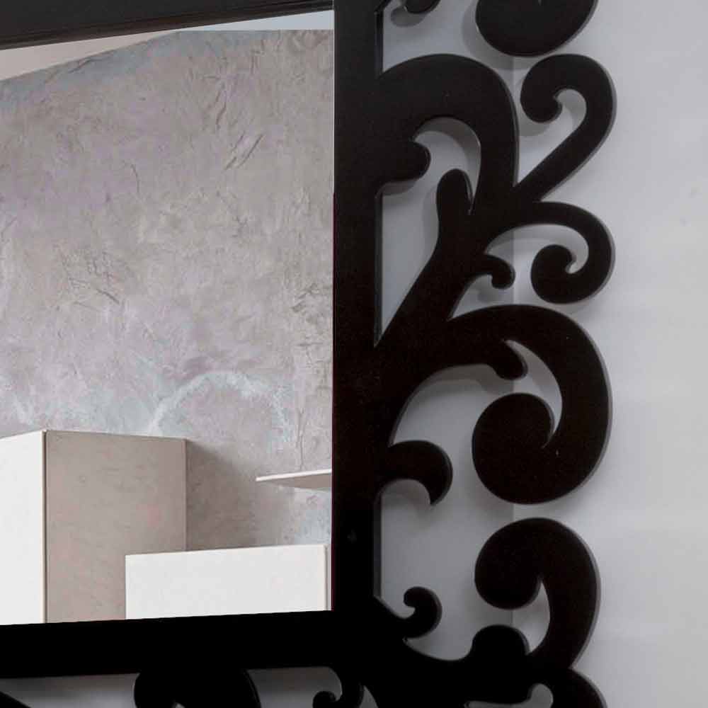 Mirror in glossy black wood with rectangular wall design with decorated frame, made in Italy.
