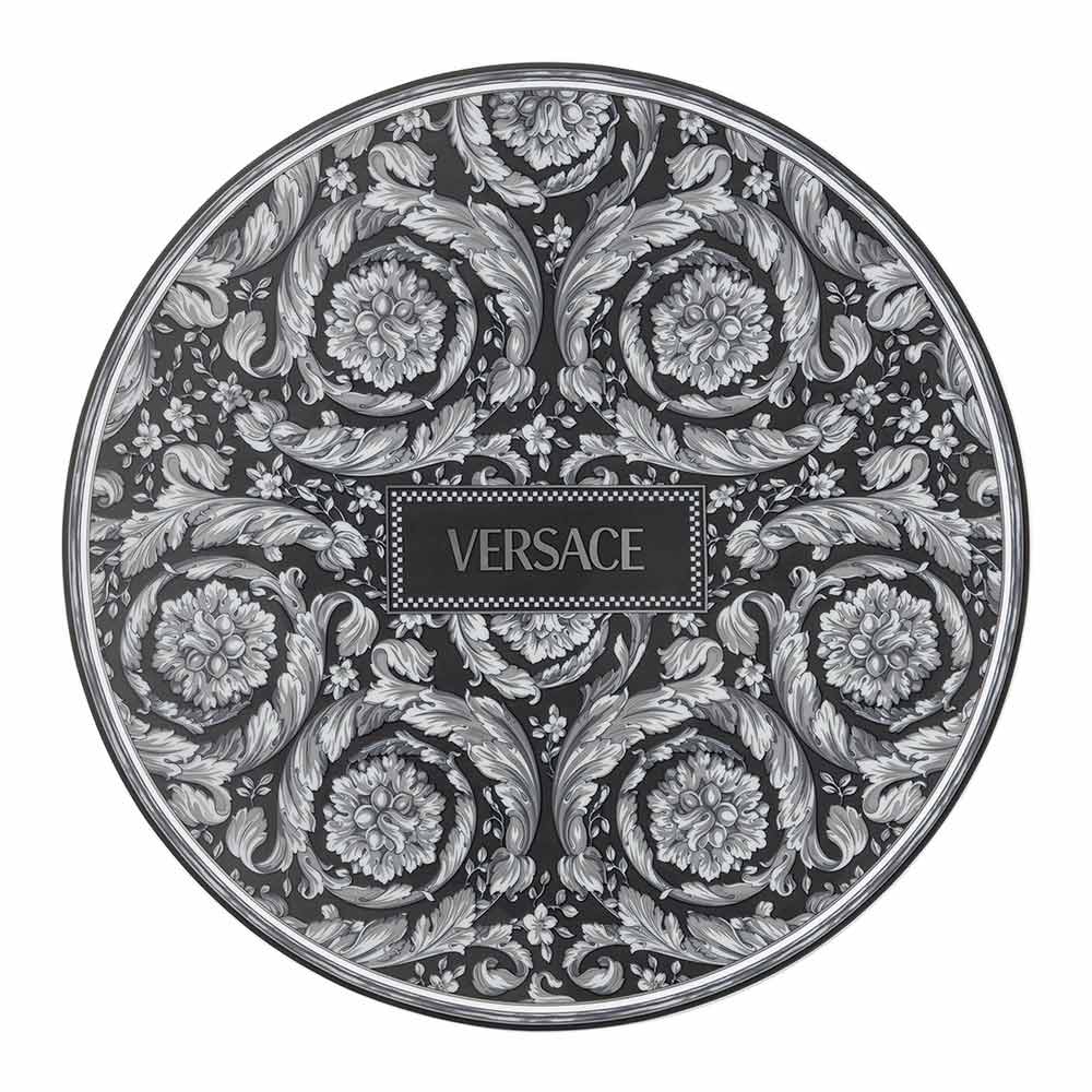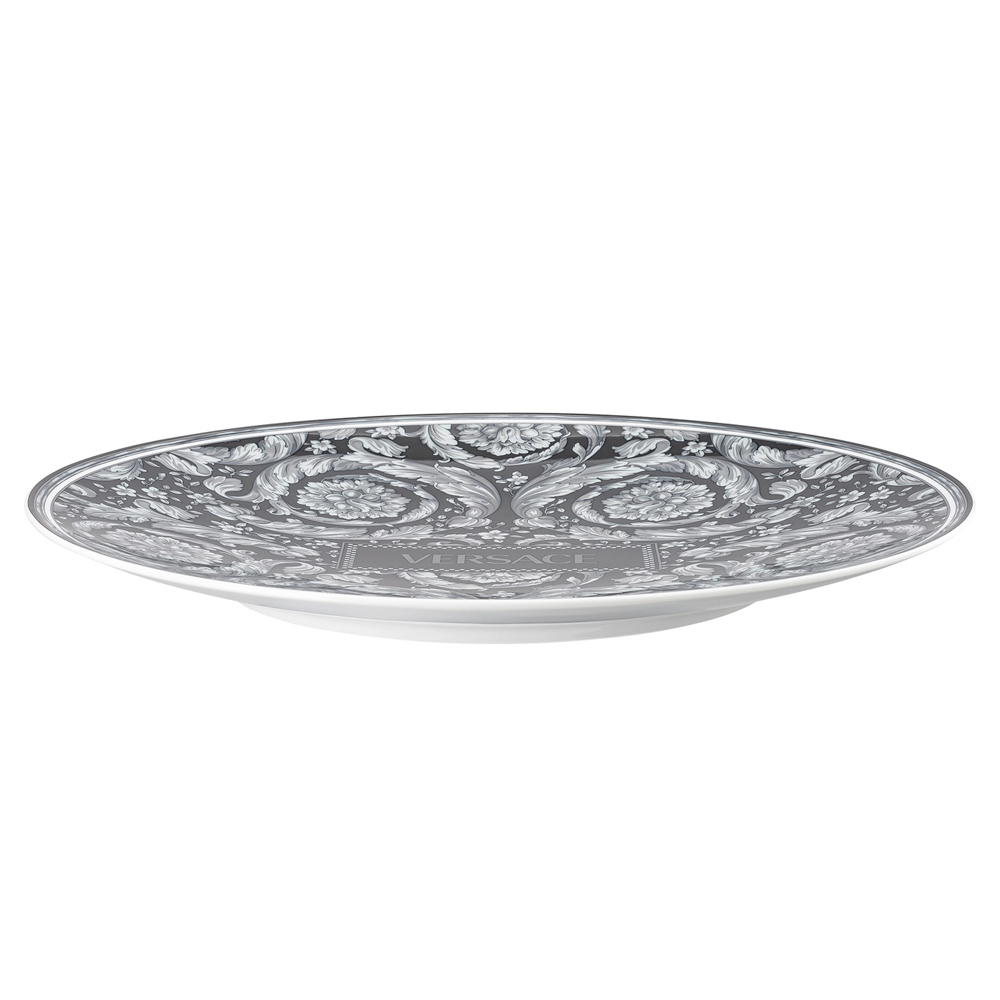This unique porcelain plate captures the essence of luxury and elegance with its intricate design of flowers and scrolls. The floral pattern in shades of grey and black adds stunning visual depth, making this plate not only a functional object but a true work of art to be displayed.