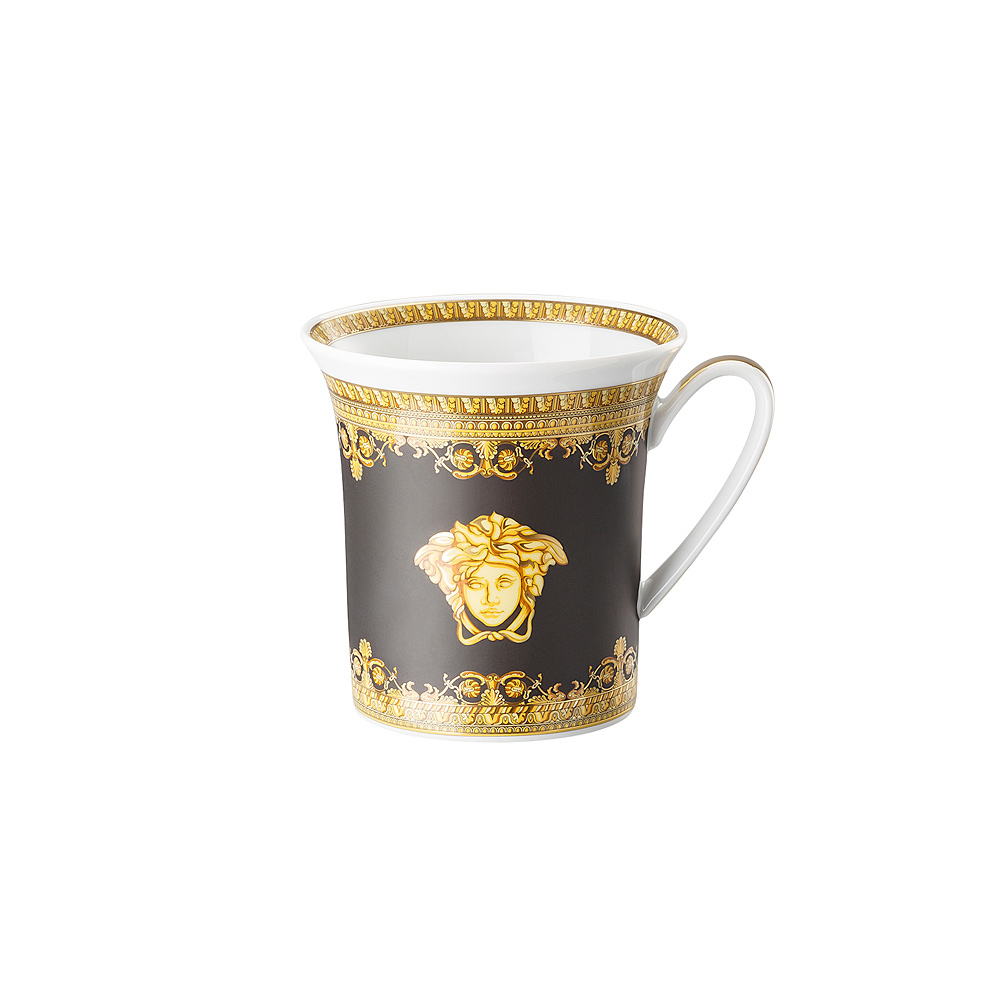 The I Love Baroque glass by Versace , crafted from fine porcelain , is an icon of timeless elegance and luxury . Featuring an intricate design, it combines the iconic face of the Medusa with golden baroque ornaments that harmoniously intertwine on a black or white background, creating a visual effect of great impact and refinement.