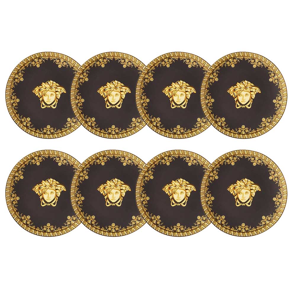 The I Love Baroque plate by Versace , made of fine porcelain , is the essence of refinement and timeless luxury . The sophisticated design features a deep black background, enriched by a border decorated with golden baroque motifs that embody the artistic tradition of the maison. In the centre, the iconic face of Medusa , a symbol of power and eternal charm, dominates, giving a regal and distinctive character to this masterpiece.