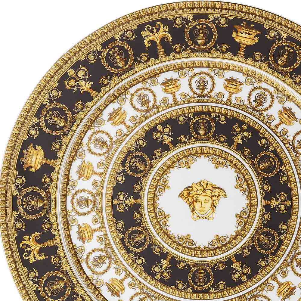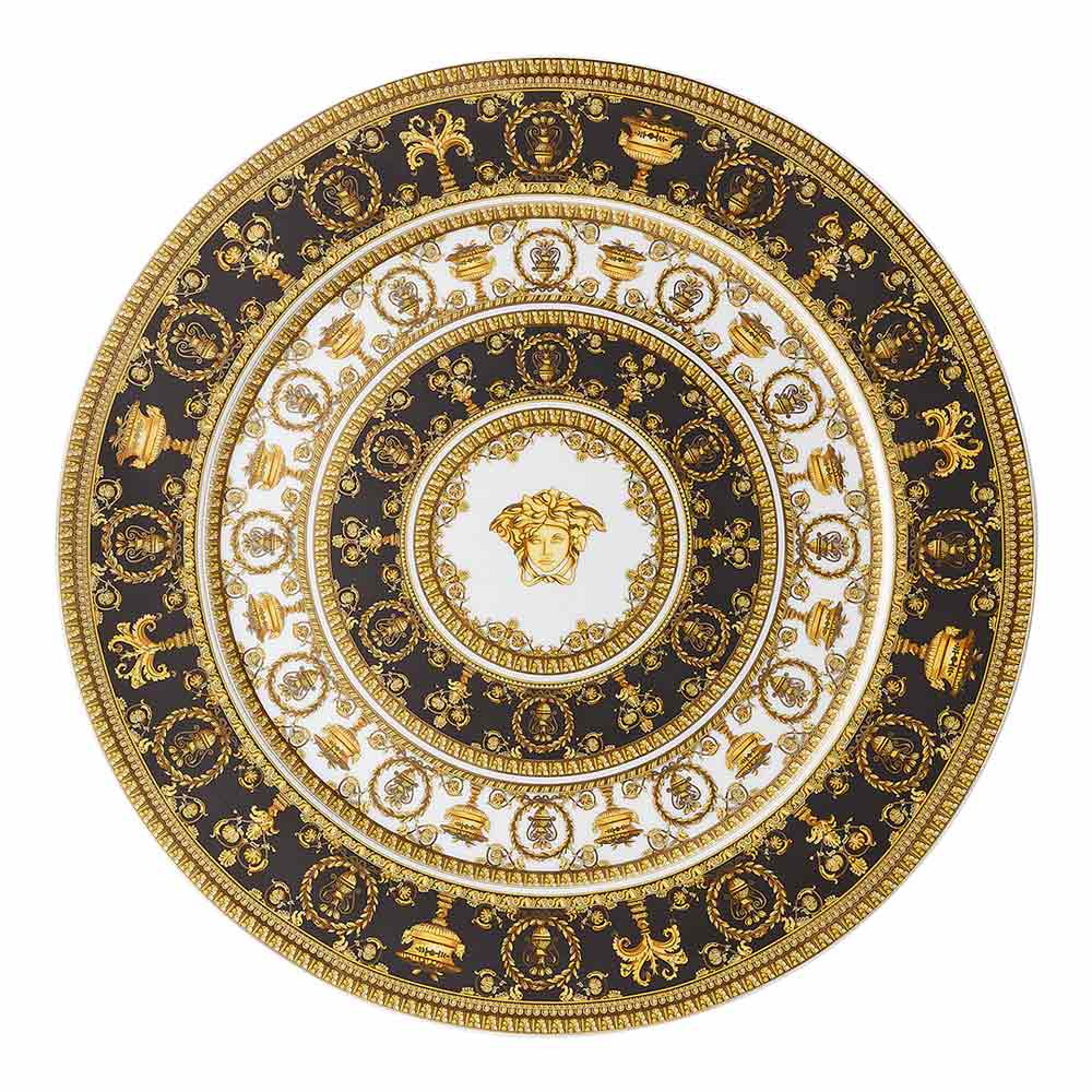 The I Love Baroque placemat by Versace , crafted from precious porcelain , is a true masterpiece of timeless elegance and refinement . Its intricate design features rich golden baroque details that harmoniously intertwine on a black and white background, creating a visual effect of exclusive luxury. The iconic face of Medusa , the unmistakable symbol of the maison, stands out in the centre, framed by ornamental motifs that enhance its regality.