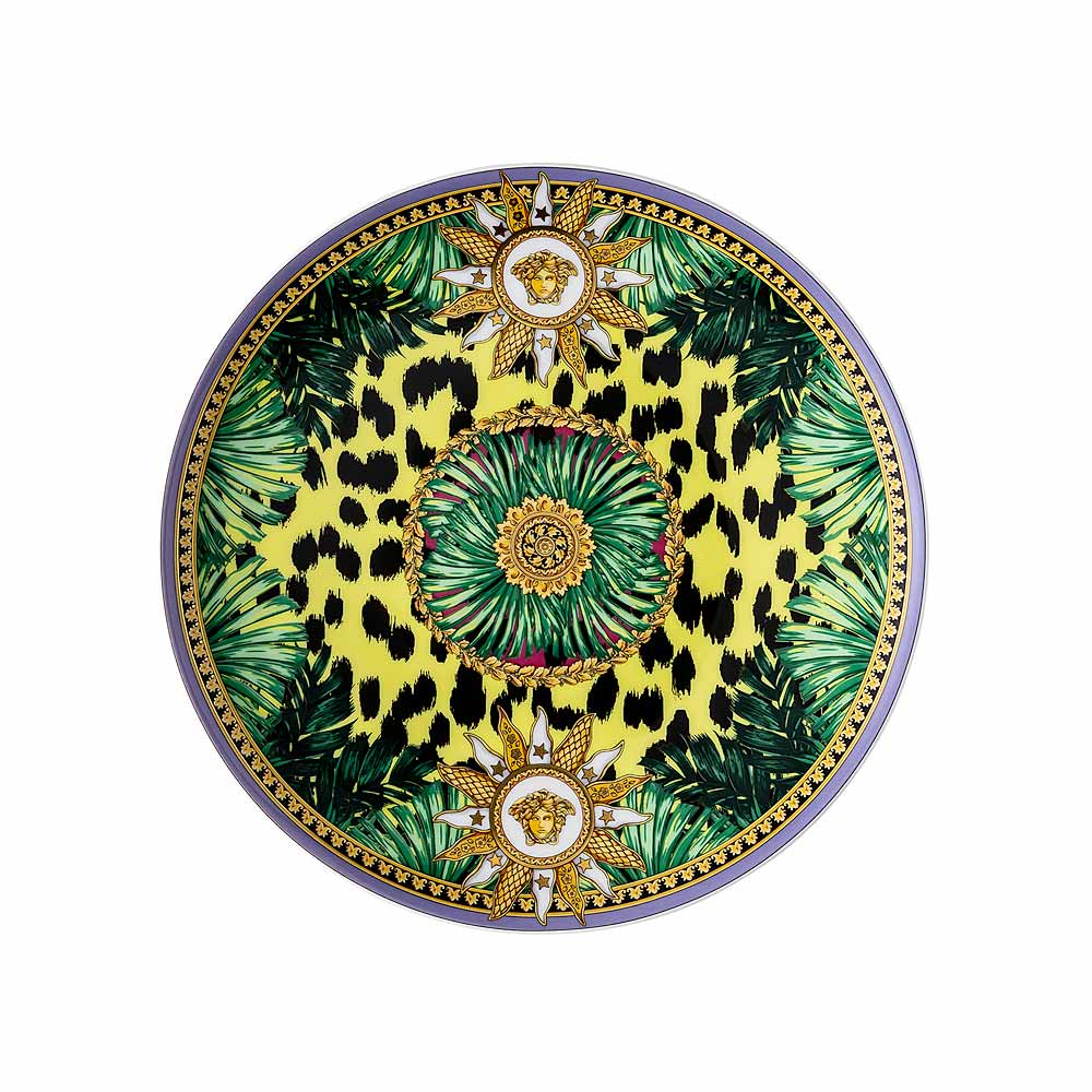 The Versace Jungle Animalier bread plate , crafted from fine porcelain , is an explosion of vitality and exotic luxury . Its bold design features a vibrant background decorated with tropical leaf motifs and animalier details, all enhanced by the iconic Medusa symbol set in a golden sun, a symbol of energy and power.