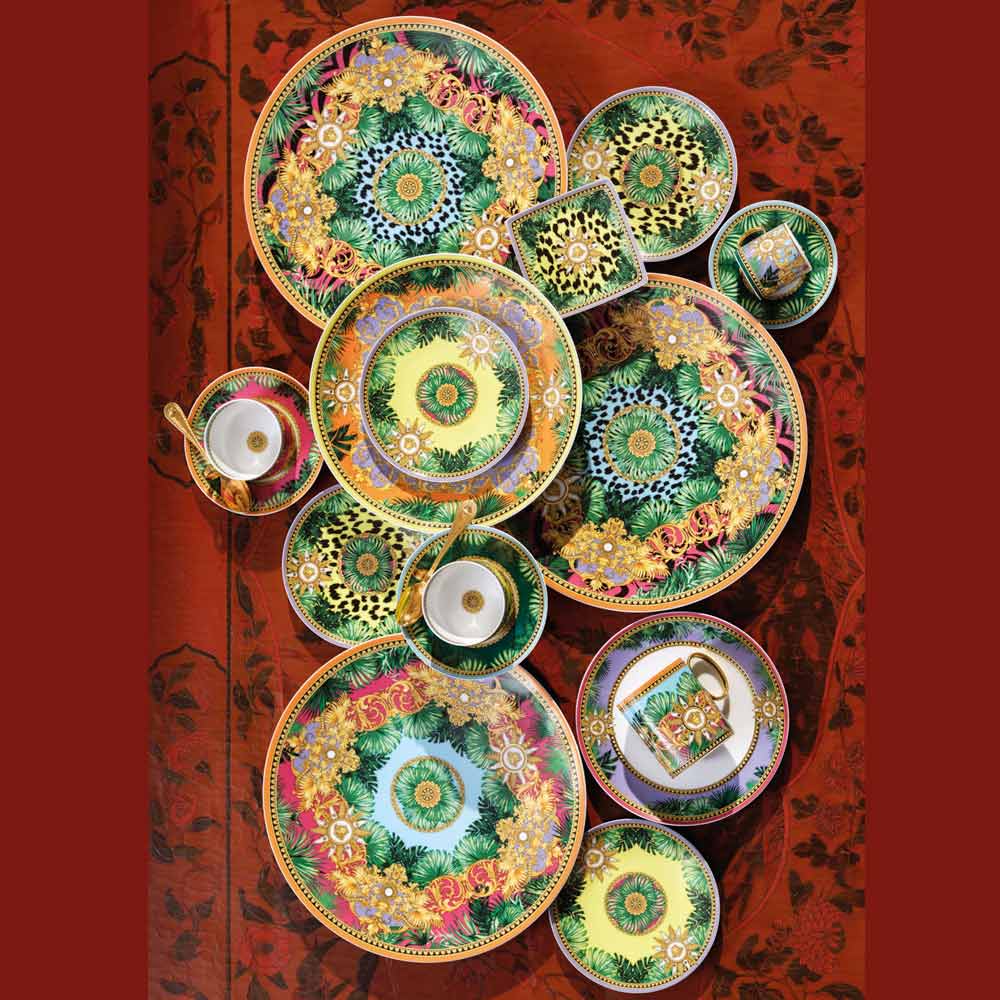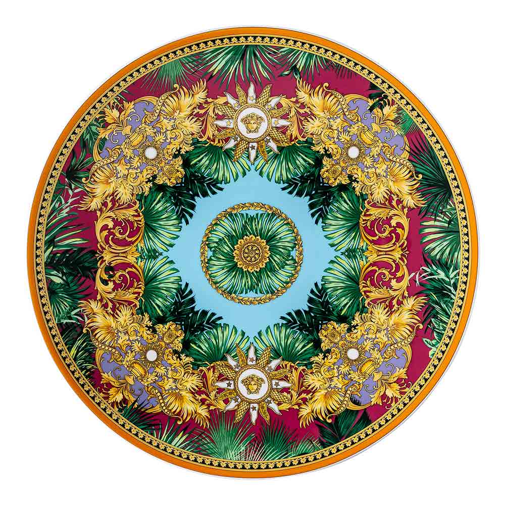 The Jungle Animalier placemat by Versace , in fine porcelain , is a celebration of exoticism and luxury . The extraordinary design combines a mix of tropical motifs , with lush leaves, golden baroque elements and the unmistakable symbol of the Medusa , set in a shining sun. The bright colours, ranging from deep green to turquoise, passing through ruby red details and golden accents, create a vibrant and captivating work of art.