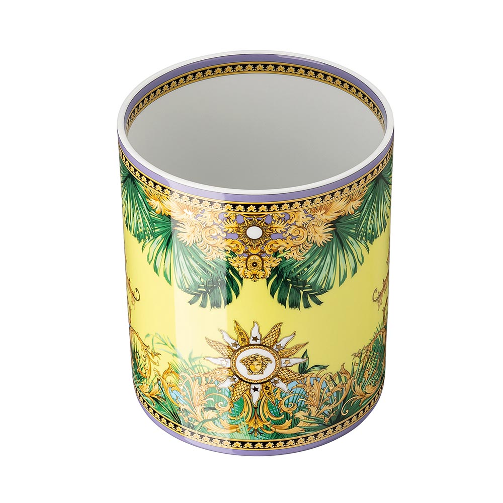 The Jungle Animalier vase by Versace , crafted from fine porcelain , is a masterpiece that combines exotic elegance and timeless luxury. The stunning design features a vibrant yellow, adorned with tropical motifs of lush foliage and intricate baroque details, all framed by the legendary Medusa symbol in the centre, set in a shining sun and decorated with gold details.