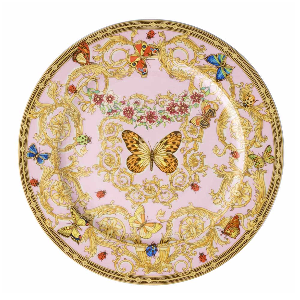 This magnificent porcelain plate celebrates the beauty of nature with its rich design of colorful butterflies and intricate floral motifs, set against a delightful pink background. Every detail is meticulously crafted, from the vibrant butterflies that appear to take flight from the plate, to the delicate flowers and gold ornaments that frame and embellish the design.