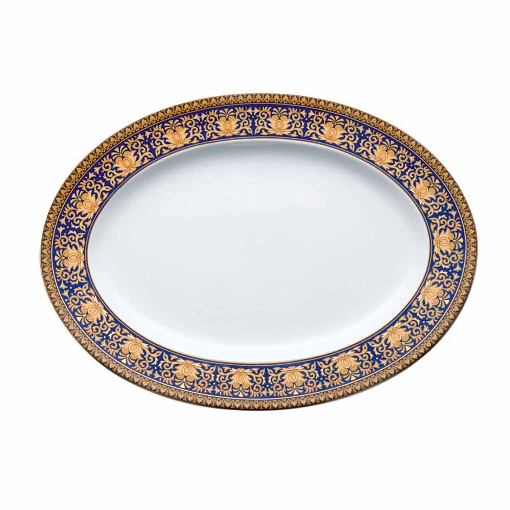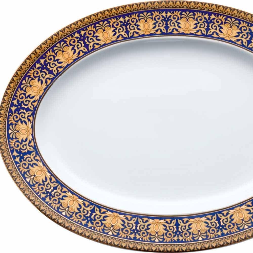 The fantastic and modern 34x24.5cm oval plate designed by Versace is part of the elegant modern collection that, combined with a fascinating and refined glamour, recalls past eras and is expressed in the bright shade of blue and takes the name of Medusa Blue.