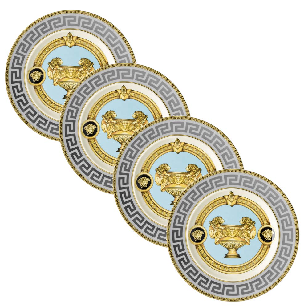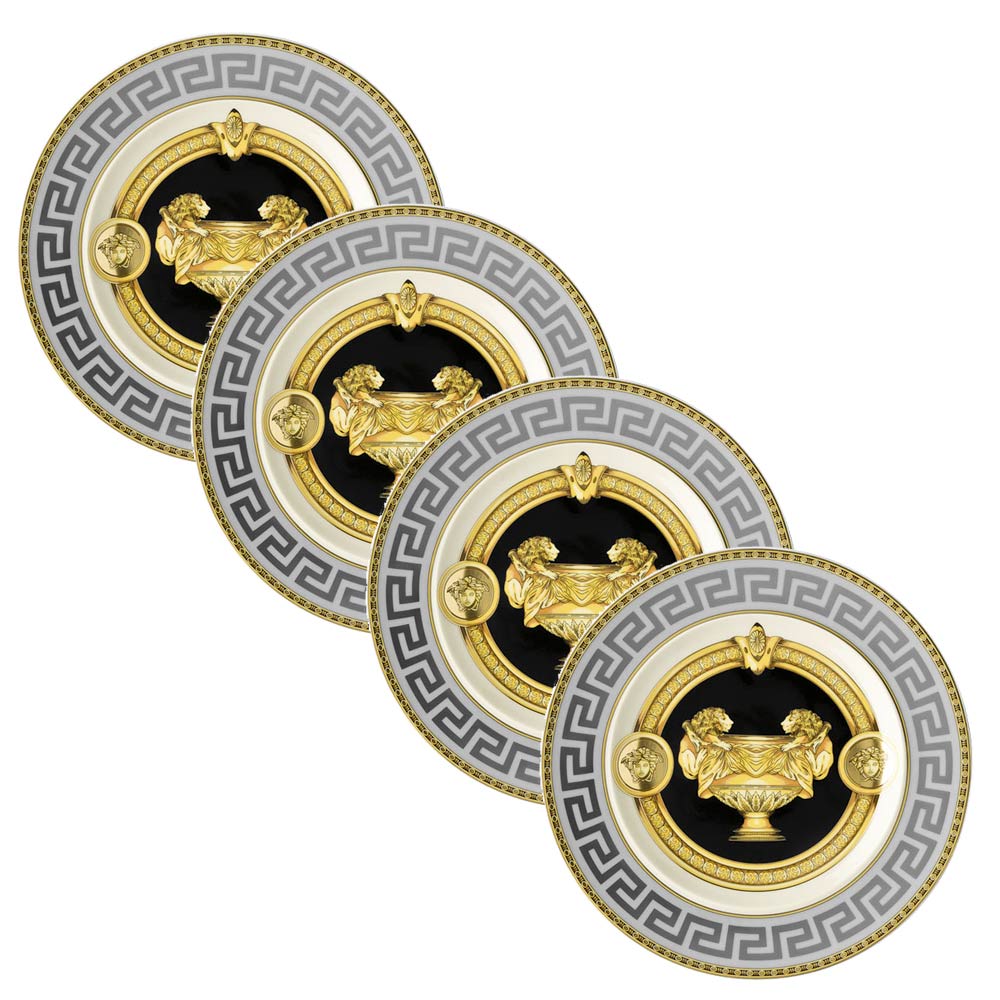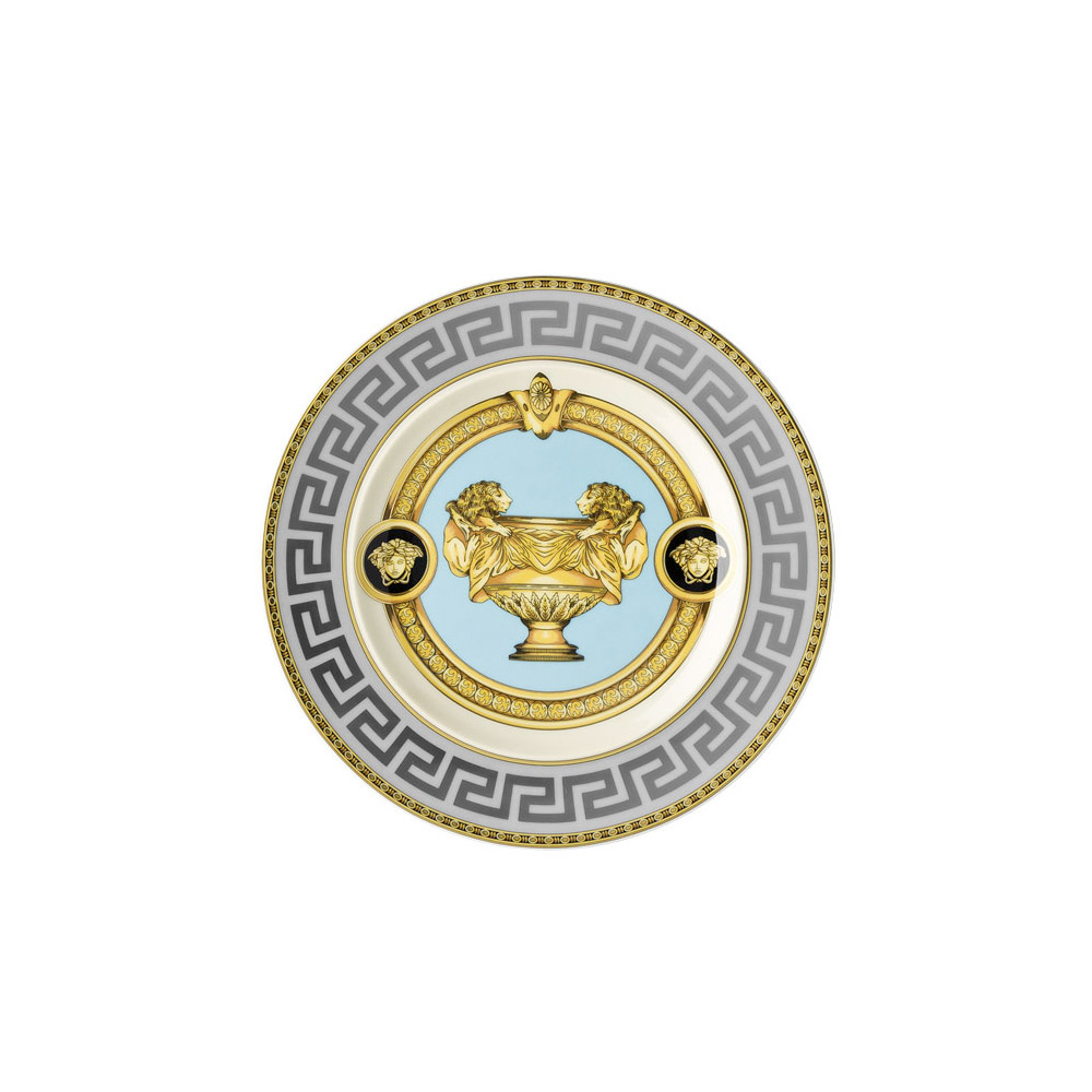 The Versace Prestige Gala Bread Plate , crafted from fine porcelain , is a perfect representation of luxury and timeless elegance . The sophisticated design features a central decoration with a golden amphora , a symbol of royalty and tradition, framed by a bold Greek motif and gold details that capture the essence of the house. Available in a black or light blue background, it offers a style choice for every occasion.