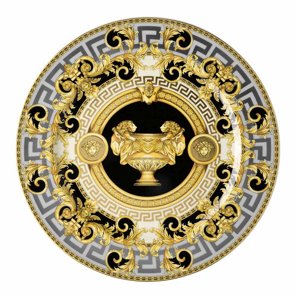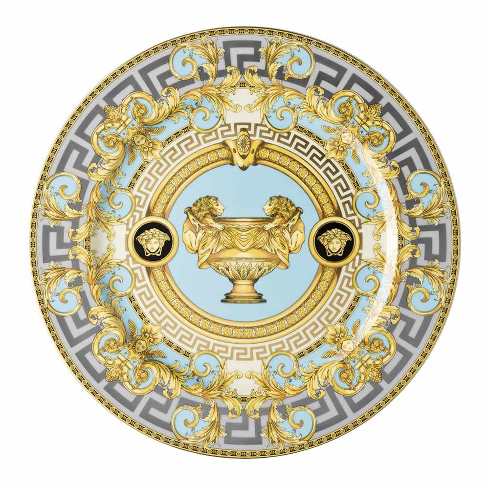 The Prestige Gala place card plate by Versace , made of refined porcelain , is an authentic tribute to classic elegance and timeless luxury. The extraordinary design is dominated by a splendid golden amphora , a symbol of royalty and majesty, at the centre of a frame embellished with the classic Greek motif and baroque floral details in gold. Available in two background variations, black and light blue, this plate offers a sophisticated contrast that elevates every mise en place.