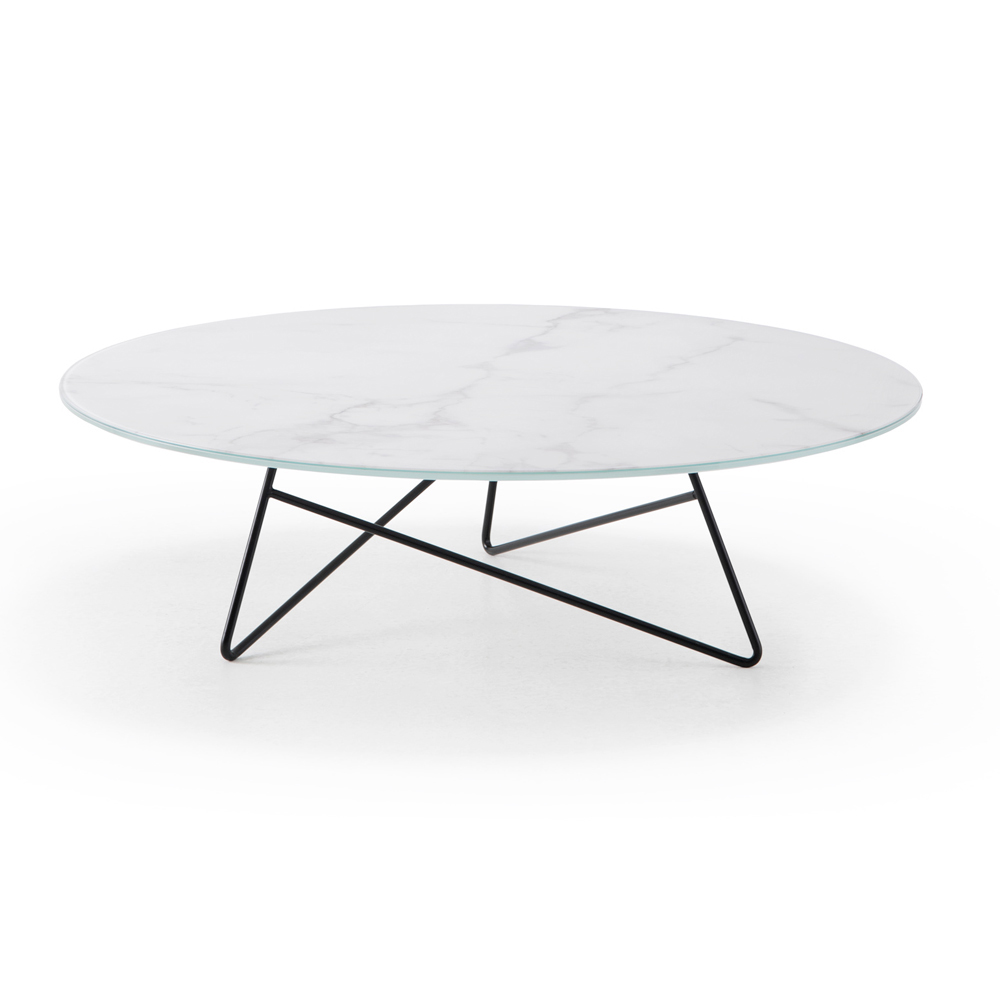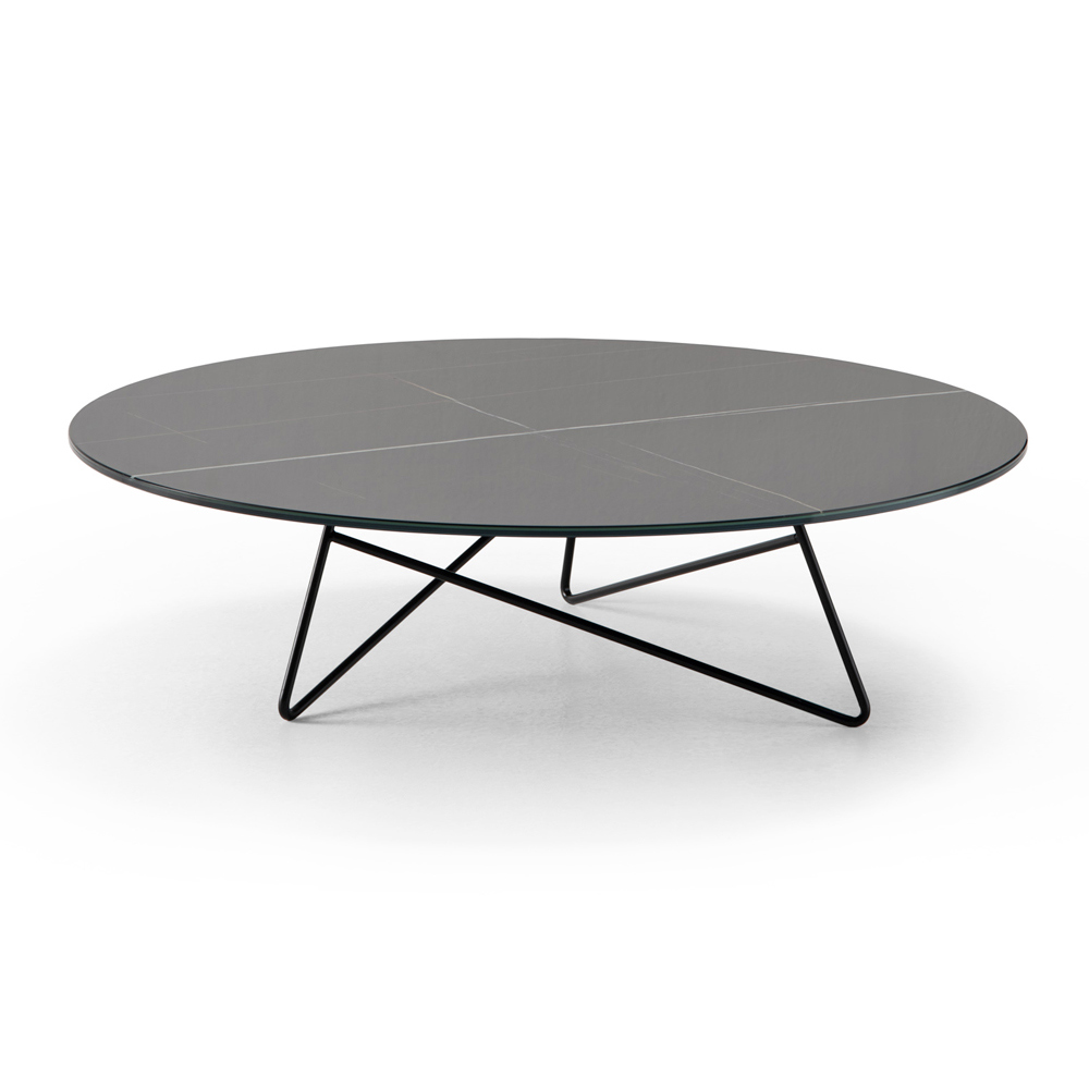 Low coffee table with round glass-marble top, luxury item made in Italy.