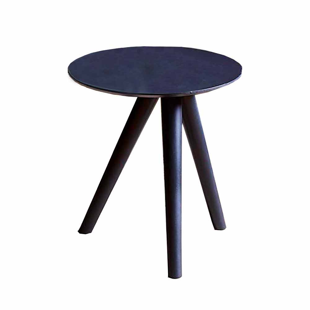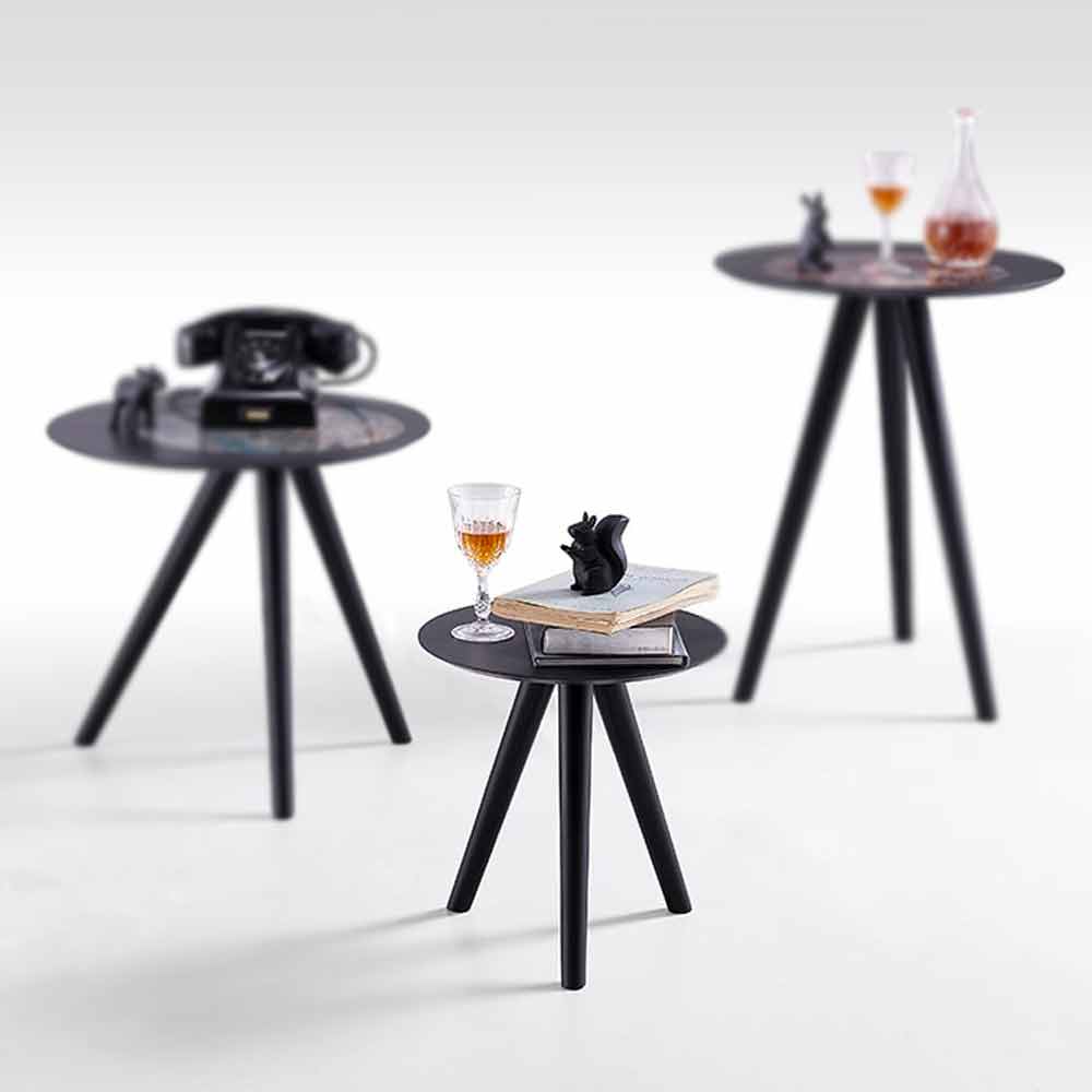 Coffee table in black grey lacquered beech with 3-legged base and 1.2 cm thick round top.
