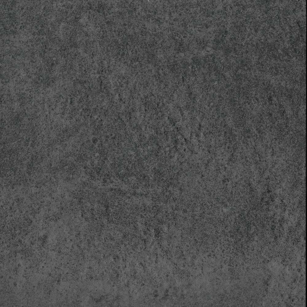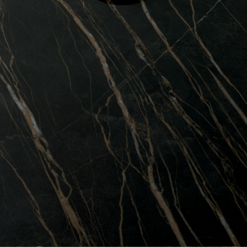This round coffee table features a powder-coated embossed graphite metal base and a matte ceramic top on panel.