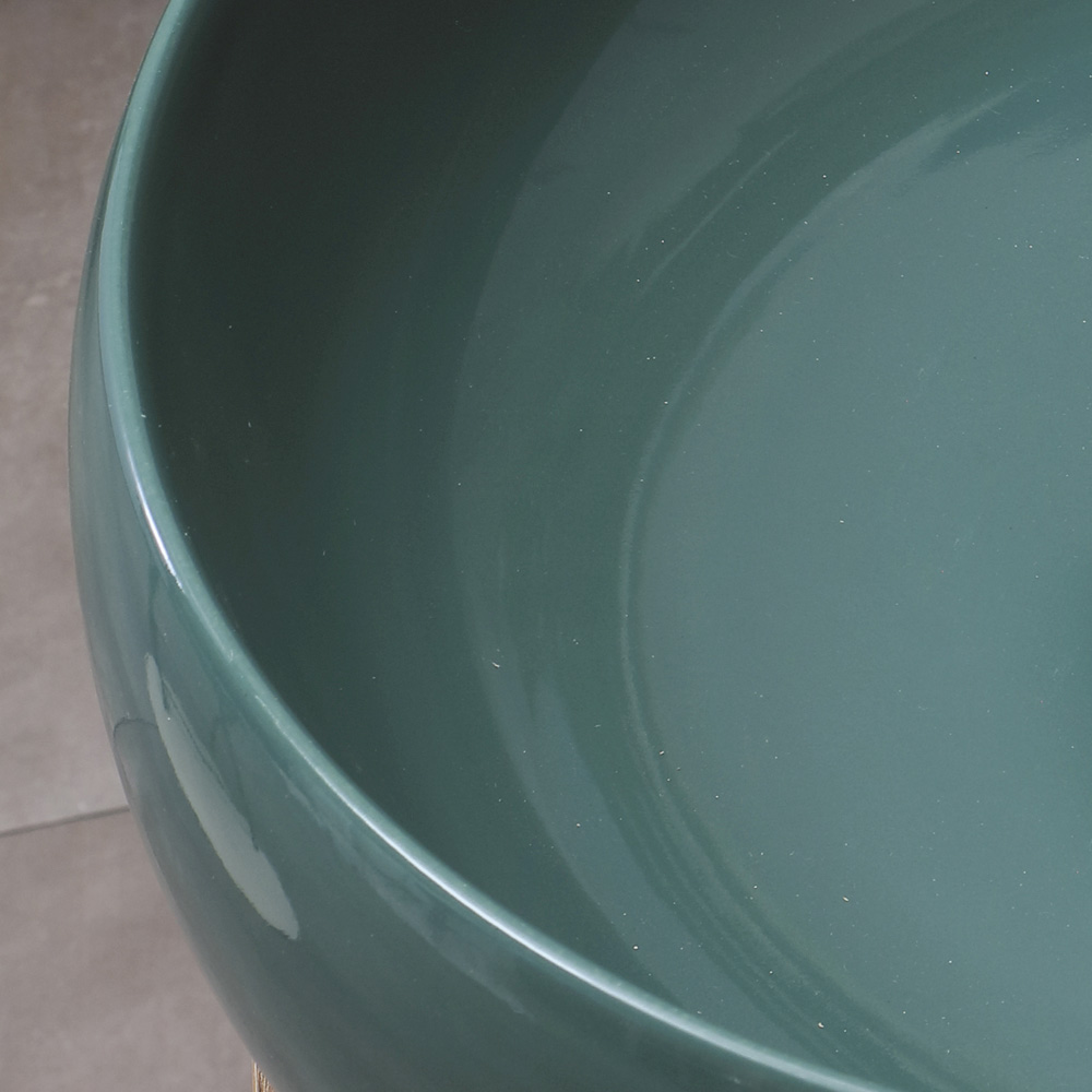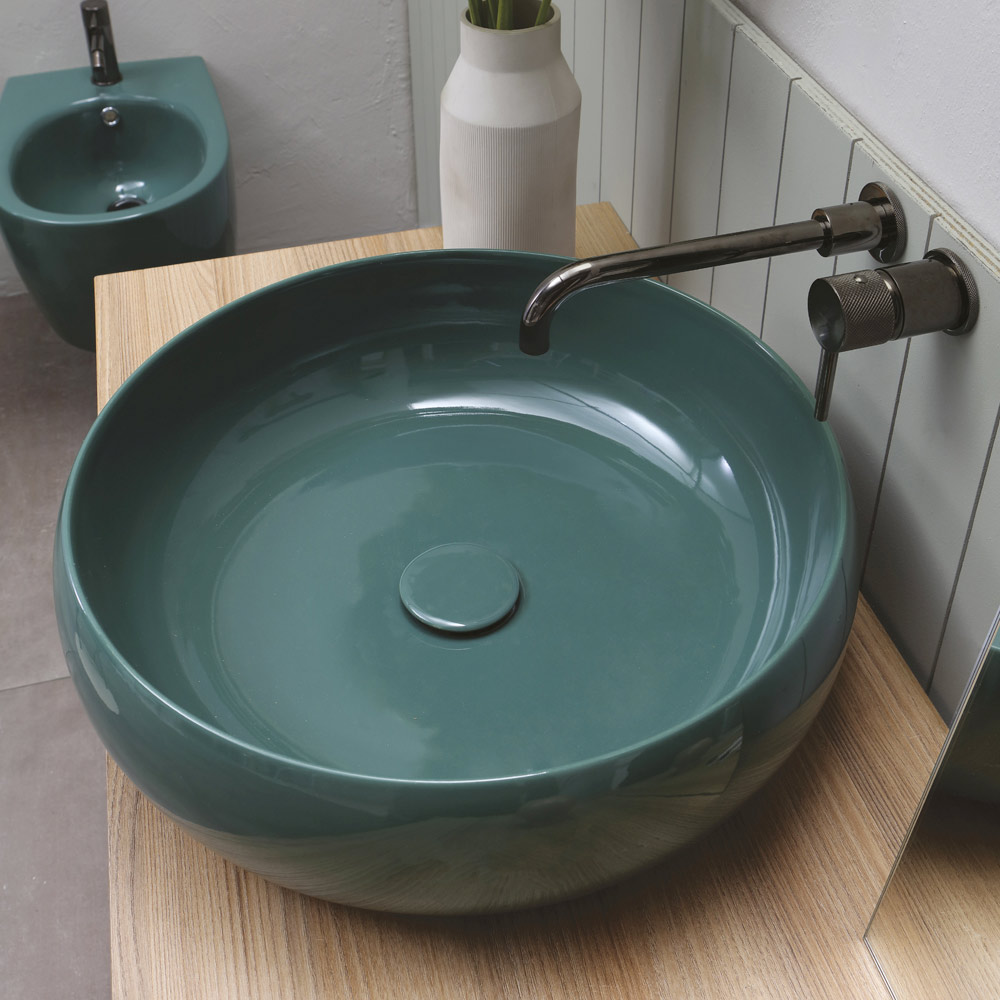 Round countertop washbasin made in Italy through a craftsmanship in glossy colored ceramic. An original and elegant piece of furniture that presents a design marked by soft and harmonious lines which give the product all its contemporary personality and its modern flavor . Ideal for bathrooms with refined and essential furnishings, this washbasin brings with it a strong scenographic impact thanks to the wonderful and unusual colours proposed that transform its simple aesthetics into a real masterpiece.