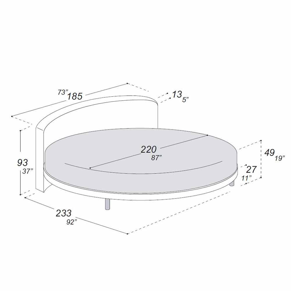 Round double bed covered in fabric with rounded headboard Made in Italy.