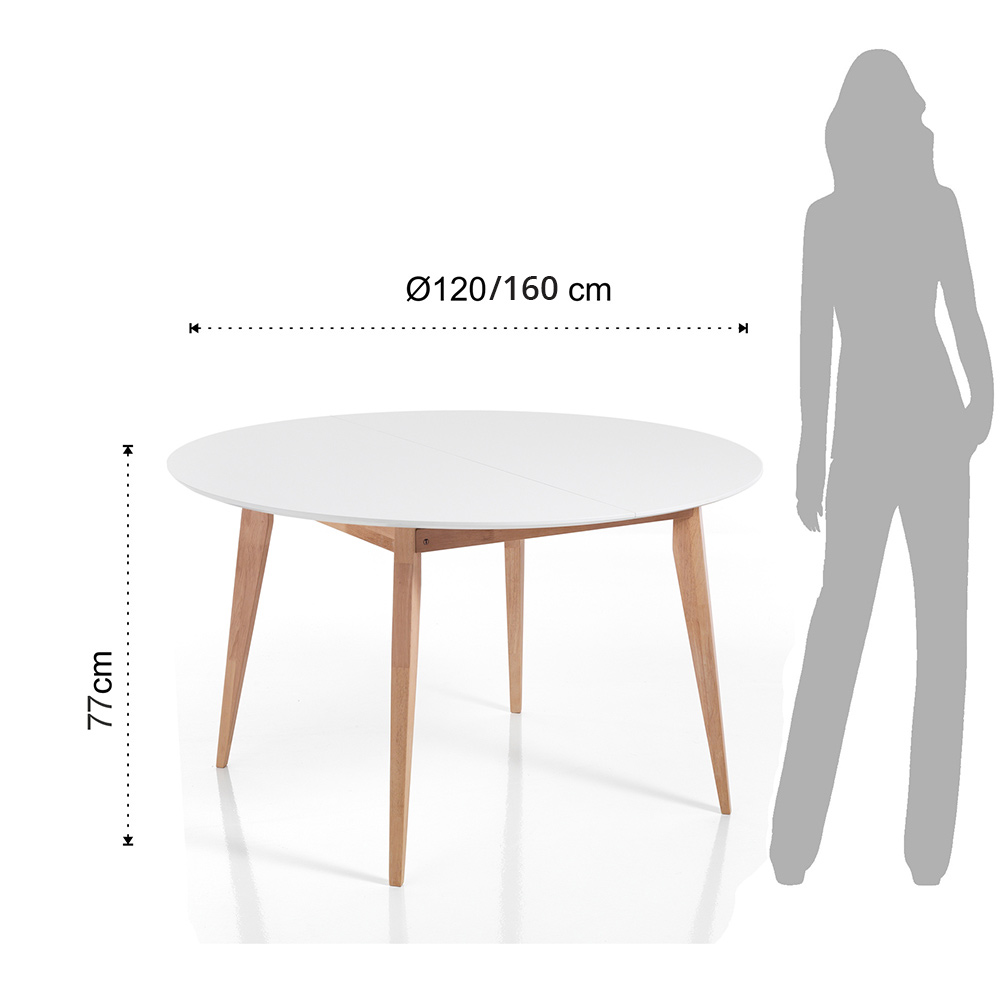 Dining table with round extendable top made of matt white lacquered MDF (thickness 3 cm) and legs in solid wood with bleached oak finish . A product with a simple and clean design, ideal for those who love an essential and versatile furnishing style capable of completing the style of their dining room or kitchen with taste and personality. Its strong point is represented by the extendable top which, thanks to an extension of 40 cm each, reaches a length of 160 cm.